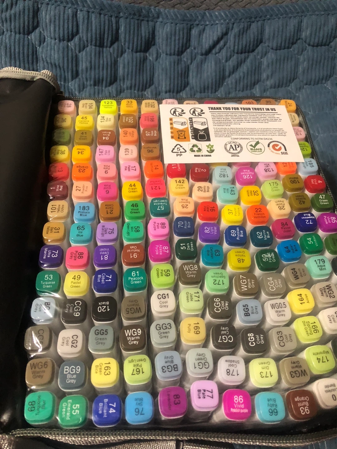 This new set includes 168 alcohol-based art markers in a wide variety of colours. Each marker is labelled with its colour name and code, and they come in a convenient black carrying case. The markers are conforming to ASTM D4236 standards.still packed in the original package box!