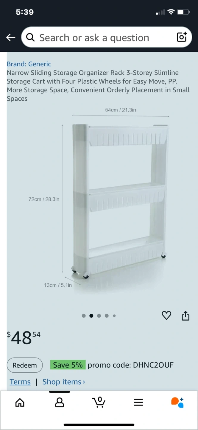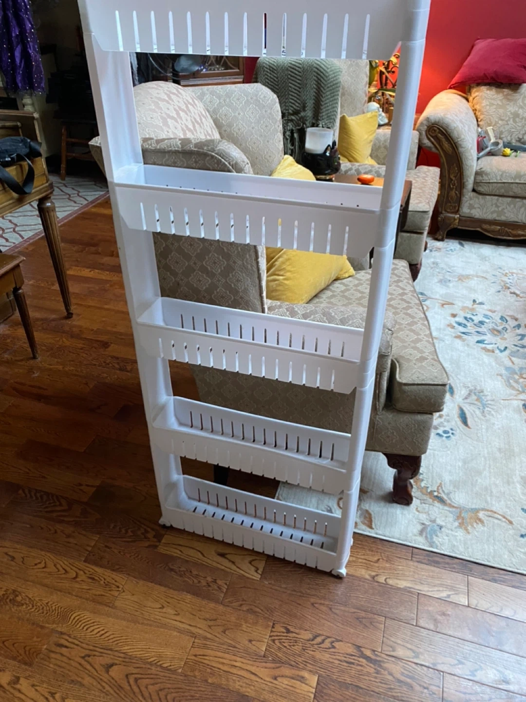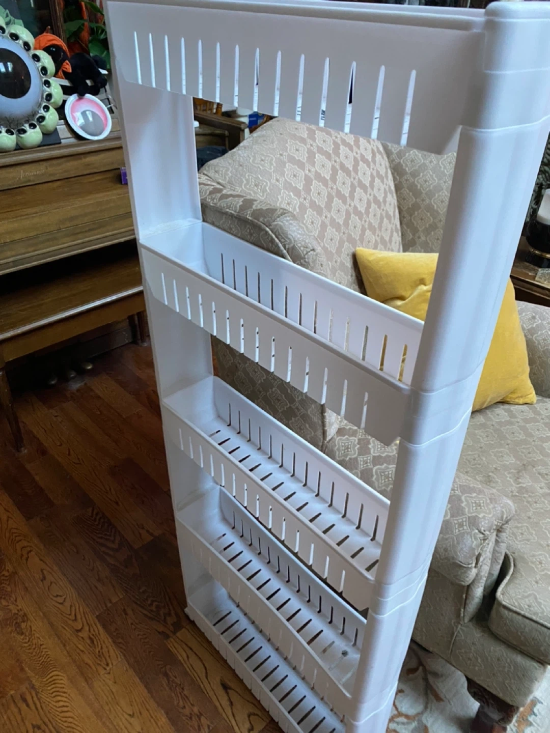 narrow sliding storage organizer rack in white. It's perfect for small spaces! It features a 5-storey slimline storage cart with four plastic wheels for easy movement. It is the exact same cart in the third picture but taller.. 21 inches wide , 5 inches deep 51 1/2 inches tall. An excellent condition. PICKERING WHITES RD & STROUDS LANE