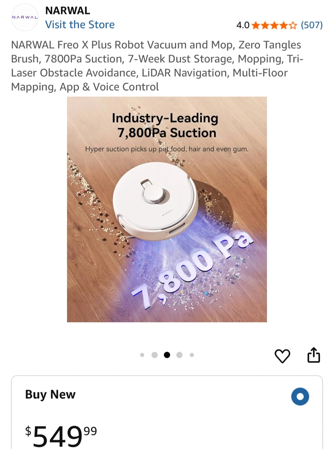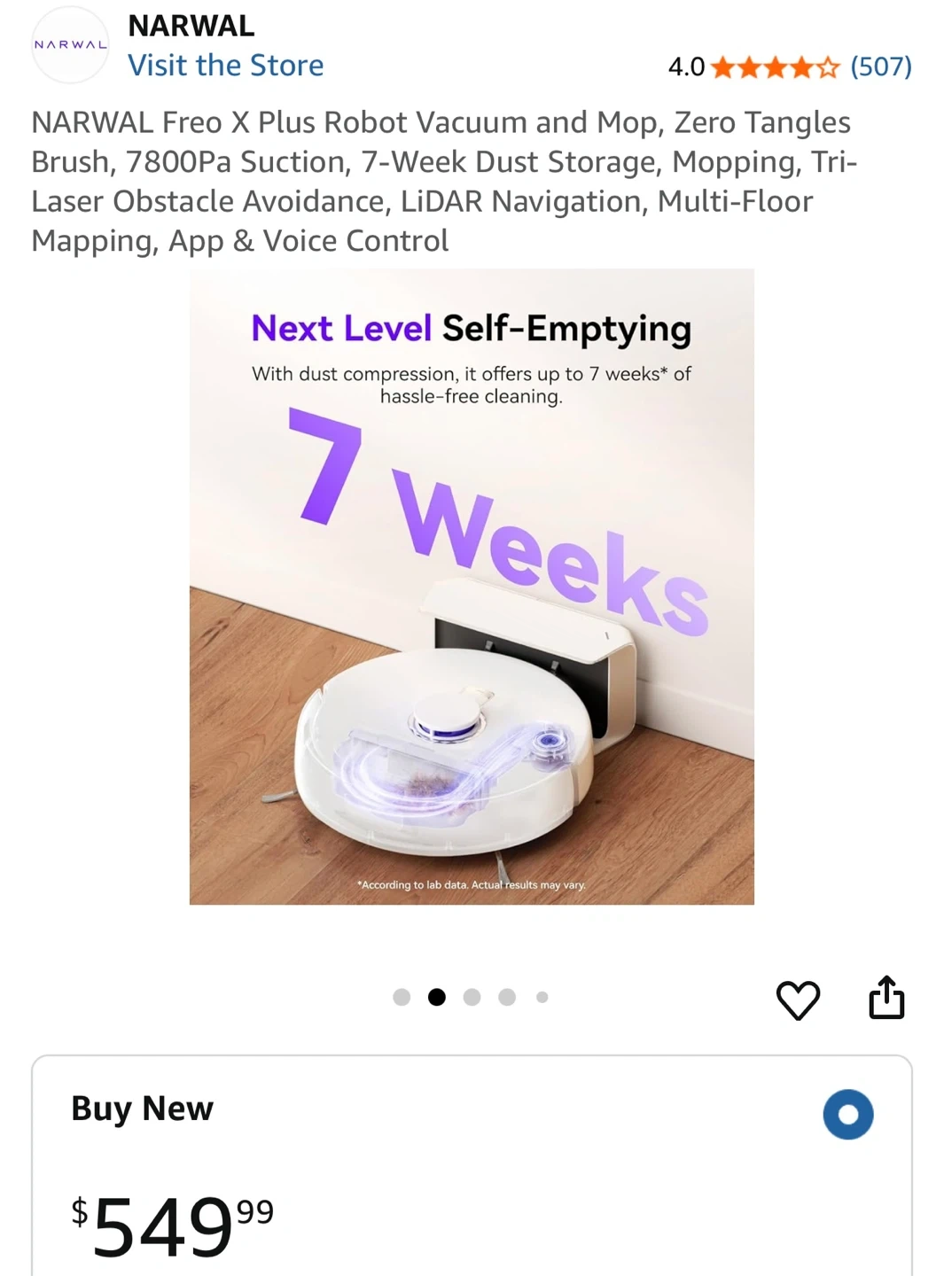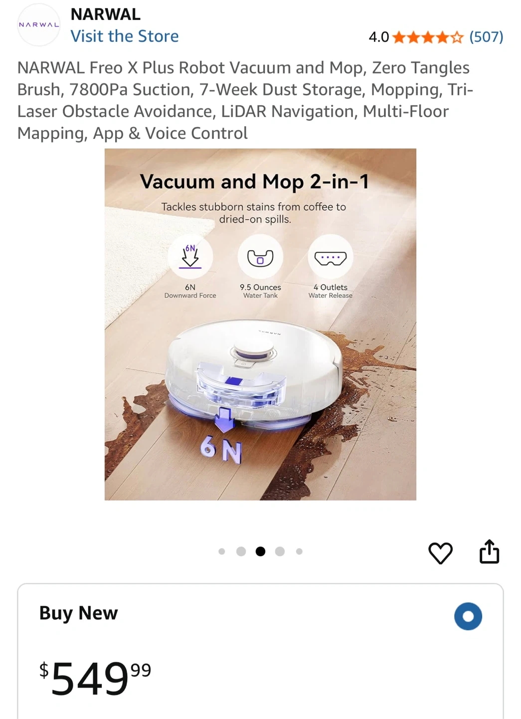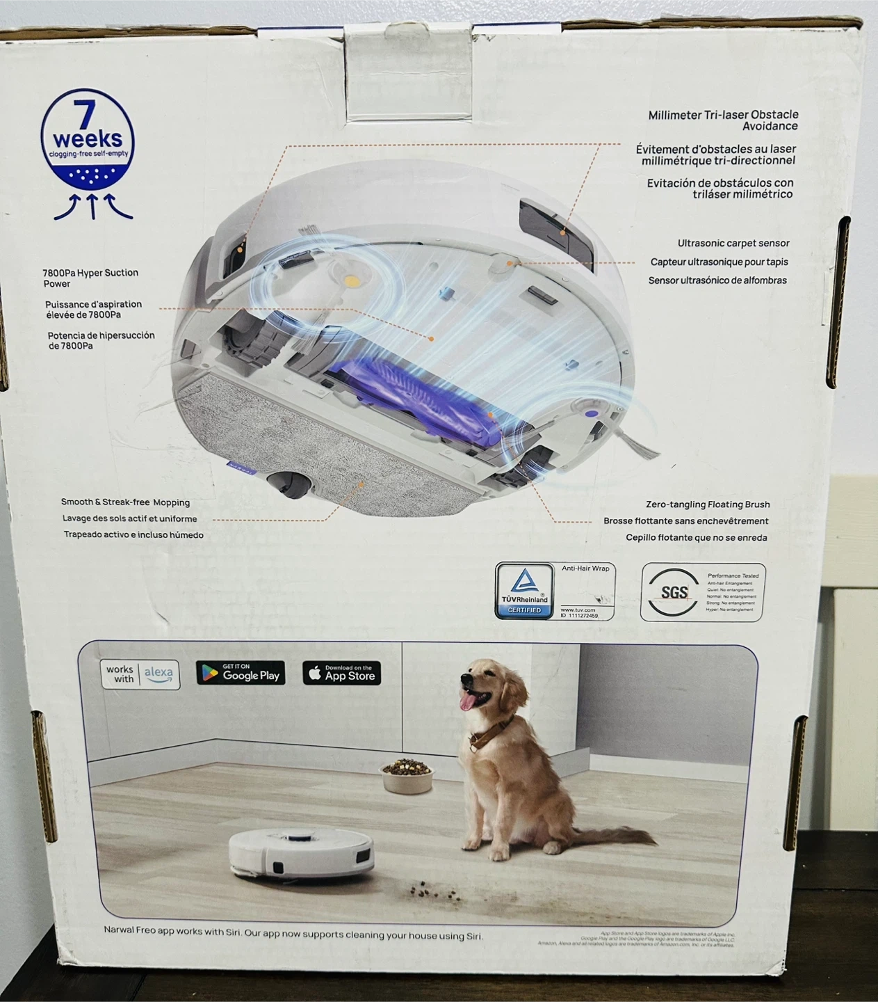 Selling a brand new Narwal Freo X Plus Robot Vacuum and Mop! It features: - Zero Tangles Brush - Millimeter Tri-laser Obstacle Avoidance - 7800Pa Hyper Suction Power - 7-Week Dust Storage - Smooth & Streak-free Mapping It also works with Alexa and Google Play. The box is included!
