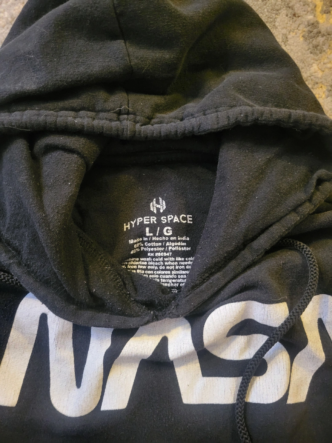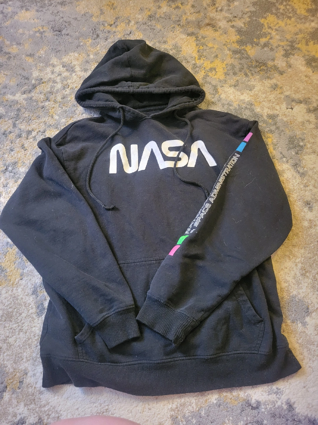 60Selling a NASA hoodie by Hyper Space in size L/G. It's black with the NASA logo on the front and some colourful stripes on the sleeve. Made of 60% cotton and 40% polyester. It's in good condition!