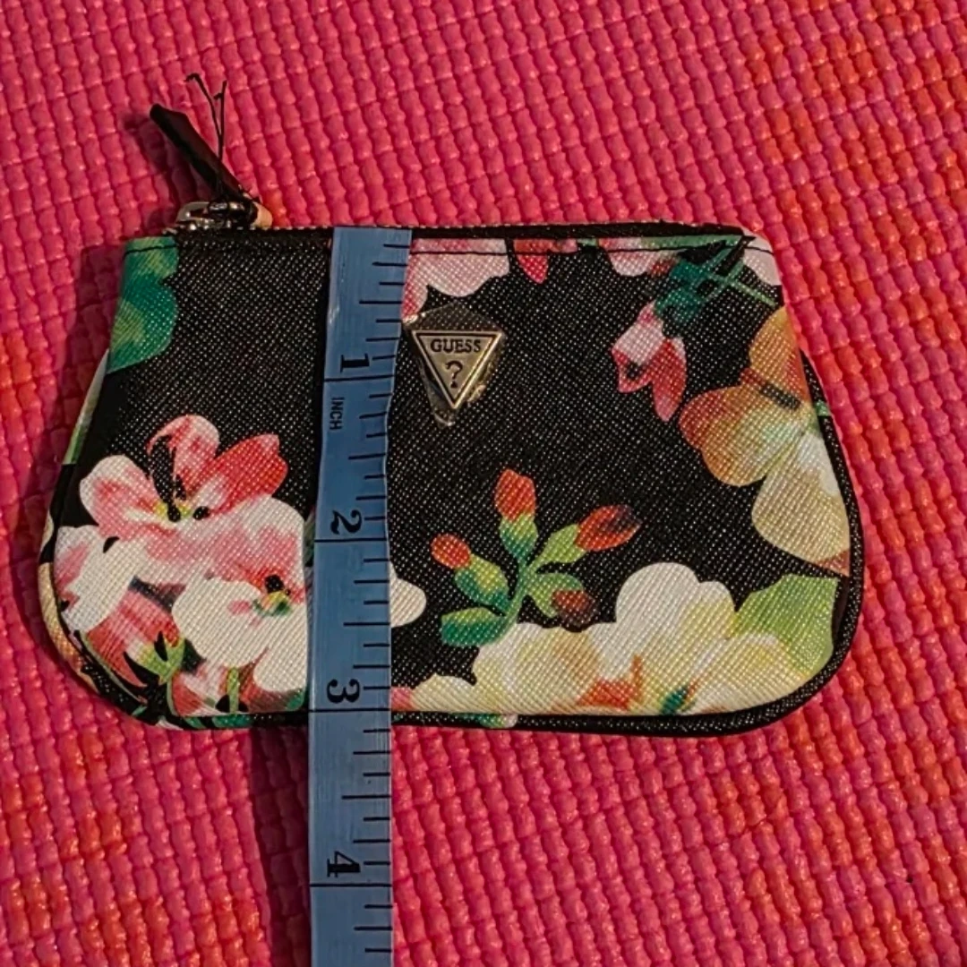 Brand new with tag, Guess coin purse with a floral print and a detachable key ring. It's made with a saffiano-style material. This could be used for loose change, cards, or small essentials. Measurements in pictures.