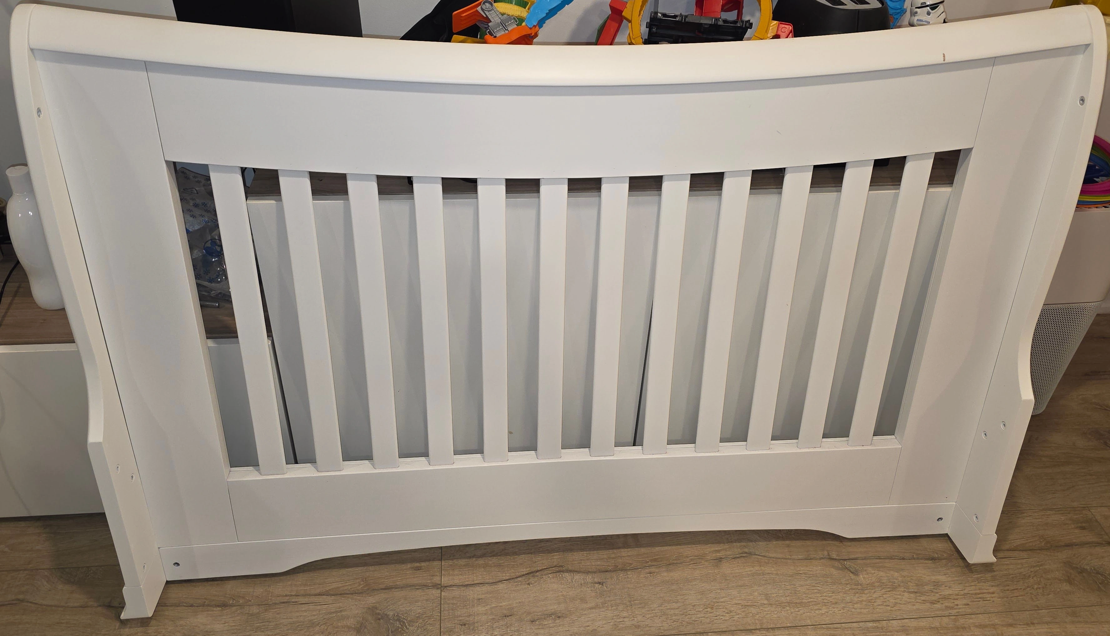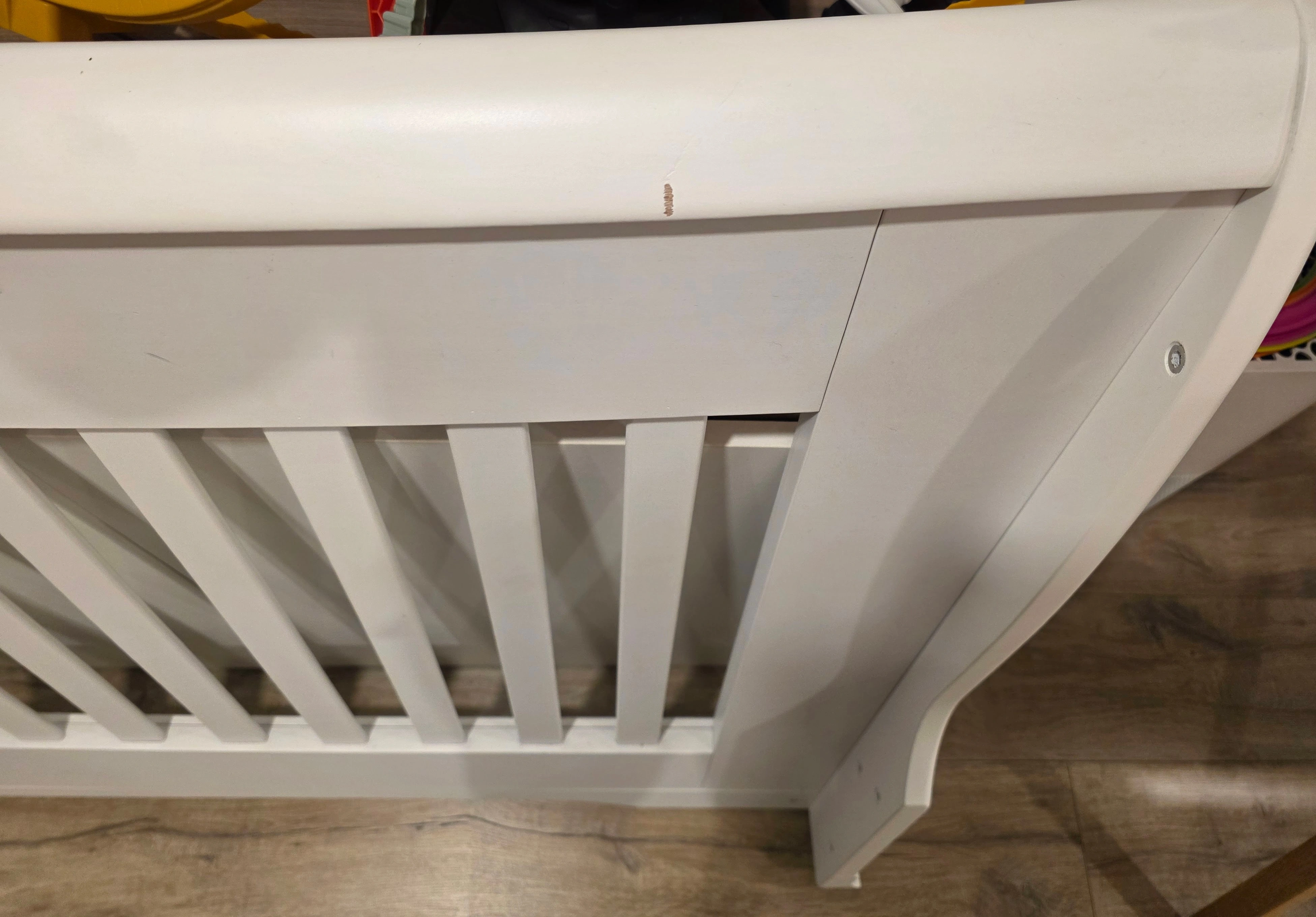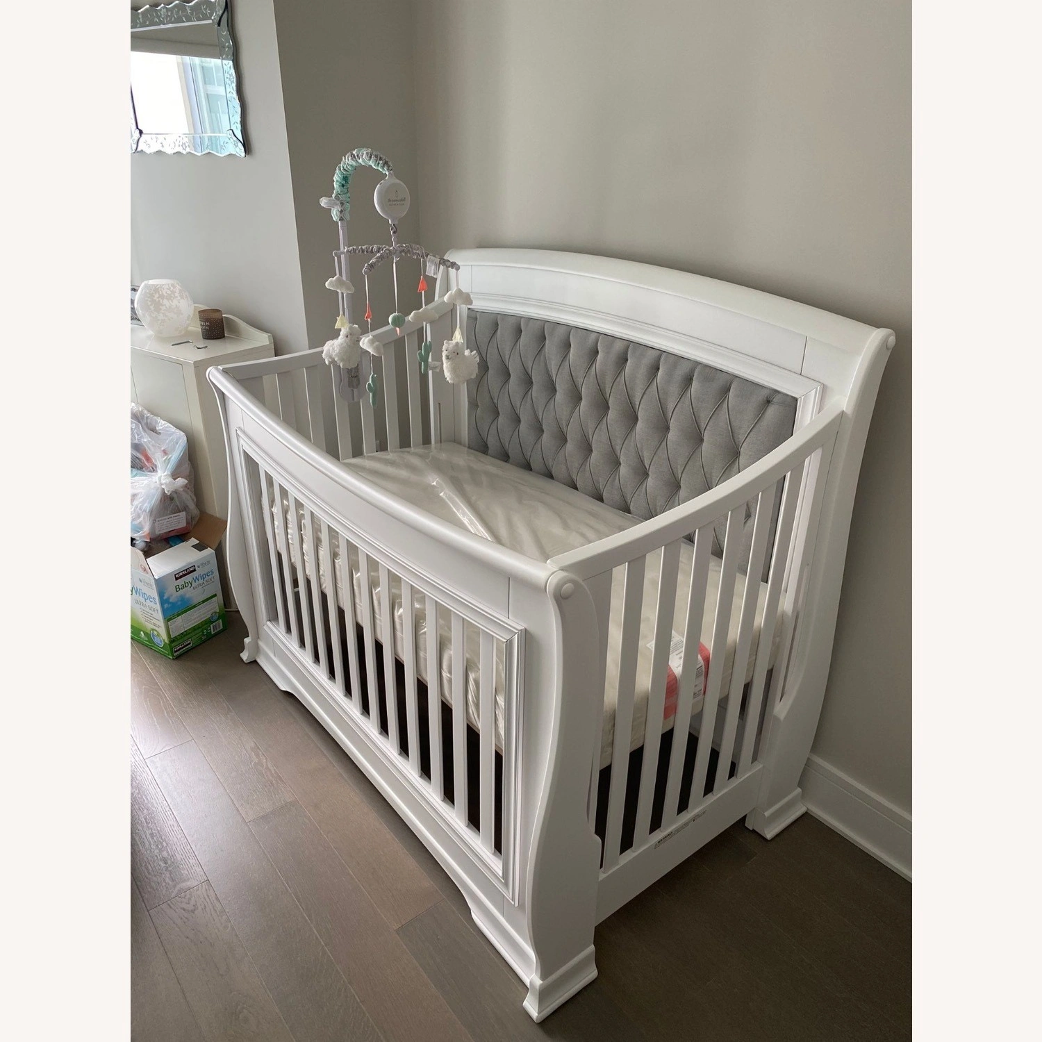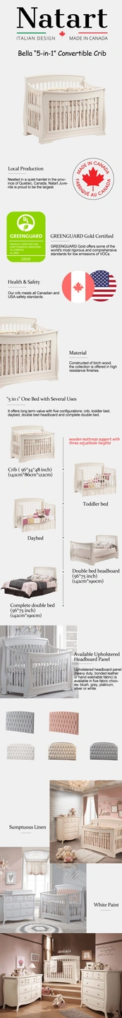 10Has one small scratch, as pictured. Otherwise good as new. Does not include attachments for the various convertible arrangements, just the original crib. Made in Canada, Greenguard Gold Certified "The TOTAL V.O.C. = 0.016 mg/m3 meaning – 13 Times less than the Greenguard Gold Certification required Sublime elegance. Flowing curves, one-piece corner posts and tapered feet lend a dignified air to Bella's timeless design. Constructed of 100% solid wood. The addition of the diamond tufted upholstered headboard panel, to the convertible crib or double bed, creates an opulence which allows for further decorating options." More details available here: https://cdn11.bigcommerce.com/s-p6xvlcn3x2/product_images/uploaded_images/bella.png?t=1597084291