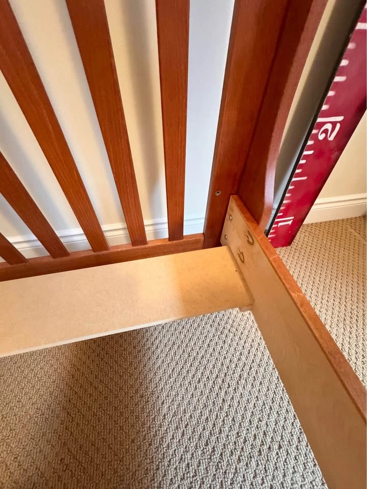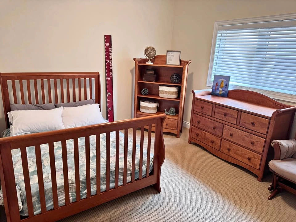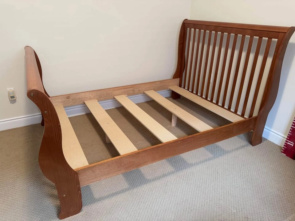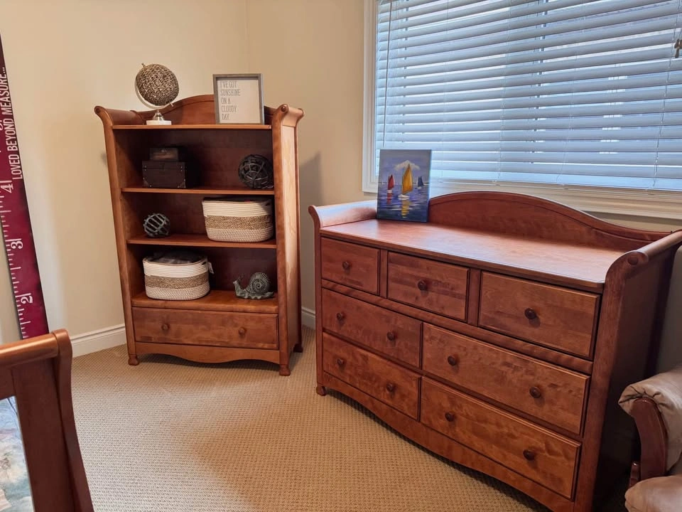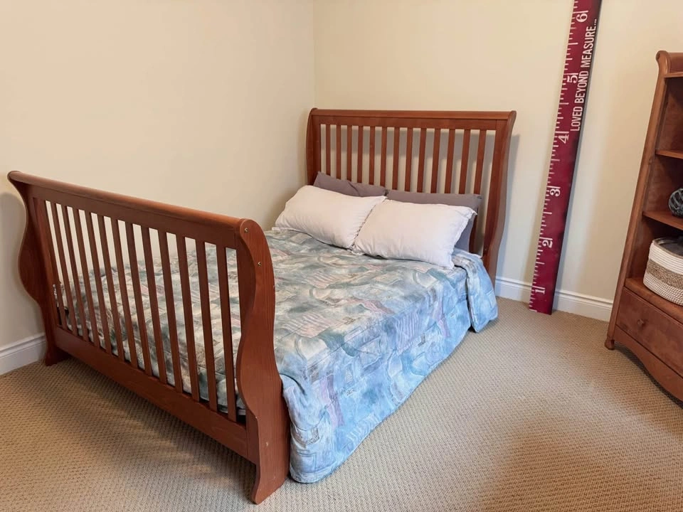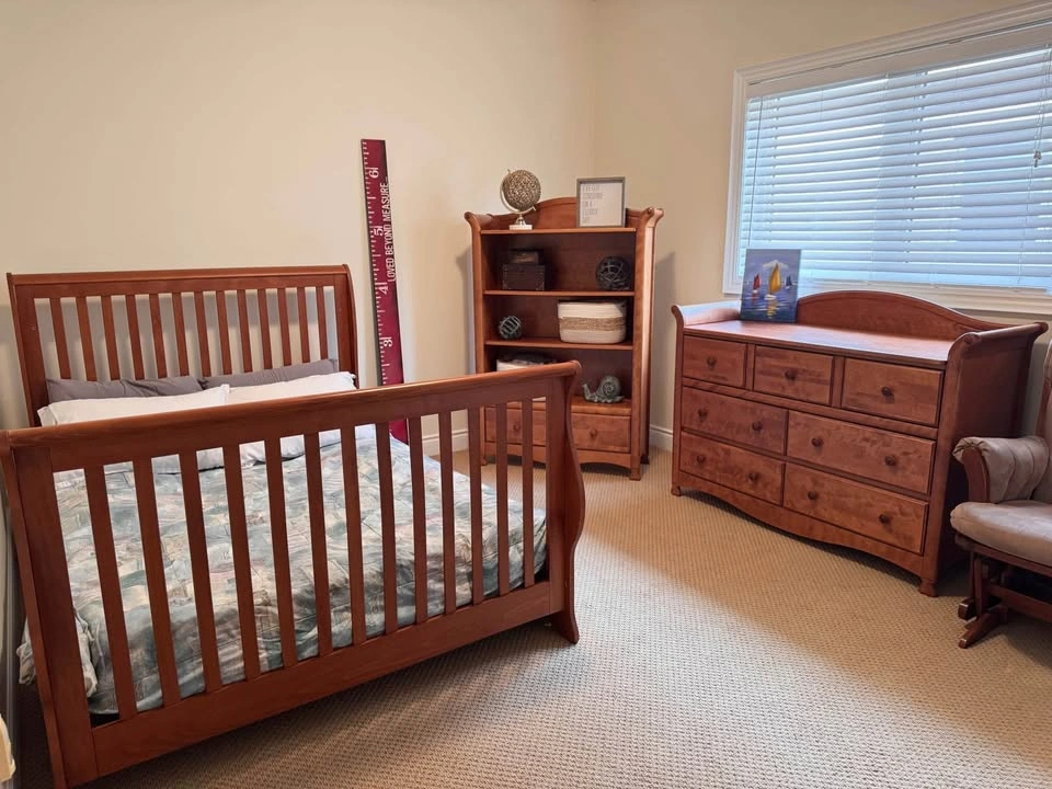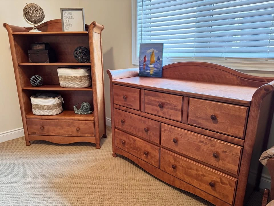 Beautiful, high-quality Natart Juvenile Morgan Sleigh collection in a rich cherry finish. Designed in Italy and proudly made in Canada. Featuring timeless sleigh-style curves, solid wood craftsmanship, and heirloom-level durability. This set includes: • Double/Full Sleigh Bed – fits standard 54” × 75” mattress (not included) • 7-Drawer Dresser – deep drawers for clothing and essentials • Matching Bookcase with Bottom Drawer – perfect for books, toys, or display Optional: • Rocking Chair with Ottoman (+$150) • Double to crib conversion kit (+$100) Gently used, very well maintained, from a smoke-free home. Timeless heirloom-quality furniture – built to last a lifetime. Measurements: • Dresser: 56 ½″ W × 21″ D × 41 ½″ H • Bookcase: 41″ W × 14″ D × 62″ H • Bed: 58″ W × 84″ L (headboard height 47″, footboard height 37″) Pricing: • Full Set (Bed + Dresser + Bookcase): $700 • Bed only: $350 • Dresser only: $250 • Bookcase only: $200 • Optional double to crib conversion kit: +$100 • Optional Rocking Chair with Ottoman: +$150 New, Natart sets like this typically retail for $3,000–$4,000. This is a fantastic deal for solid wood, Canadian-made furniture. PICKUP ONLY CASH