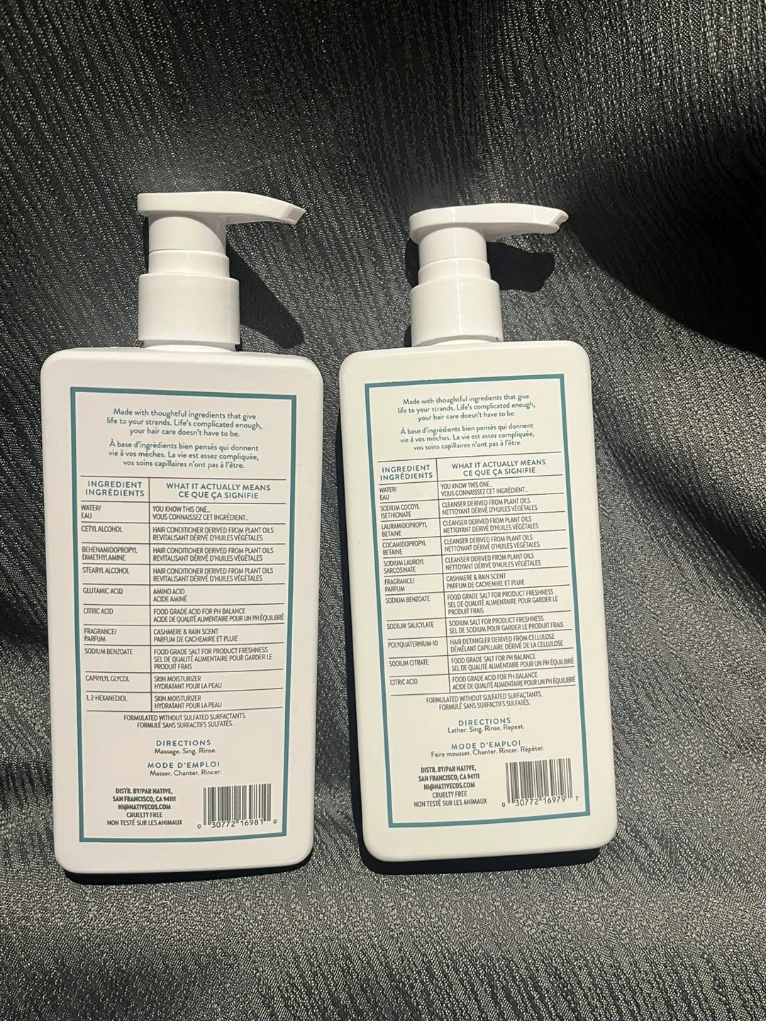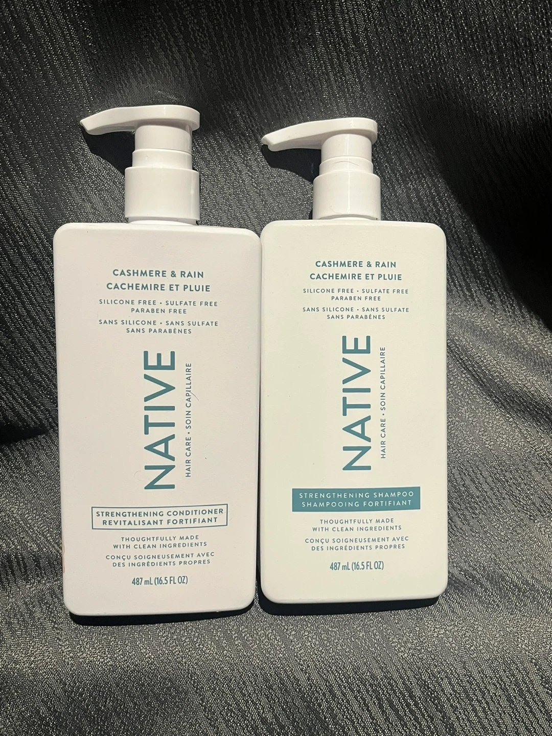 I have a set of Native Strengthening Shampoo and Conditioner for sale! They are from the Cashmere & Rain collection and are silicone, sulfate, and paraben-free. Each bottle contains 487 ml (16.5 fl oz).