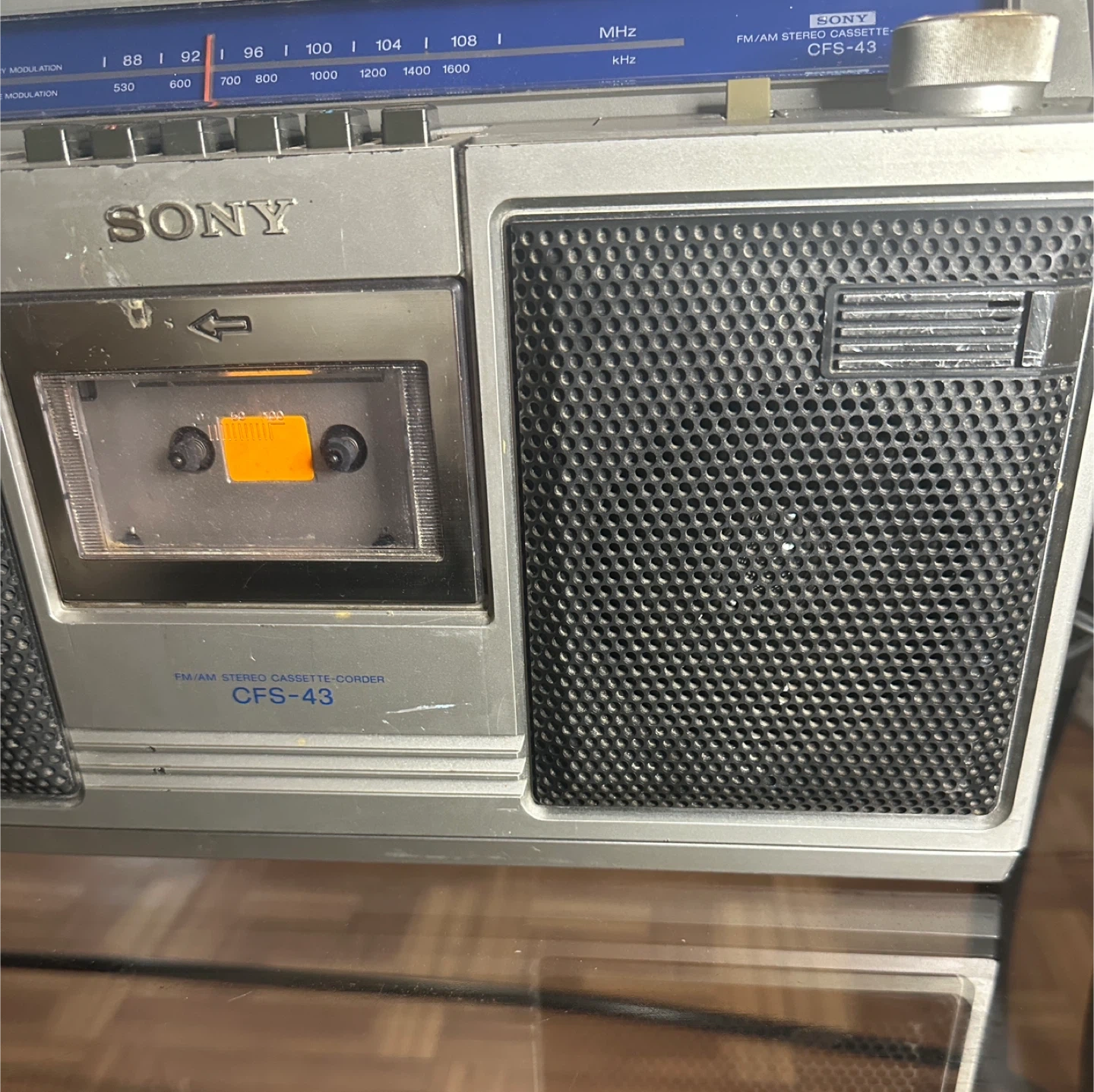 This is a Sony CFS-43 boombox with FM/AM radio and cassette player. It features a silver-tone finish and a black speaker grill. The cassette deck has play, fast forward, and rewind controls.
