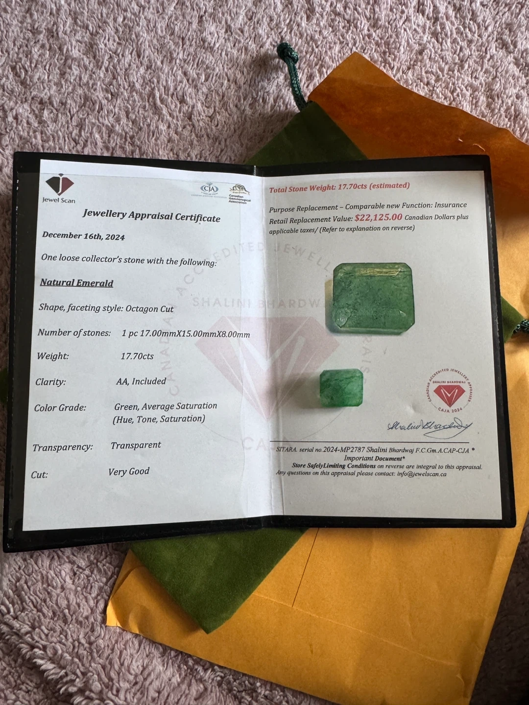 Selling a natural emerald with an octagon cut. It weighs 17.70 carats and has AA clarity. The color grade is green with average saturation. The shape is one piece 17.00mmX15.00mmX8.00mm