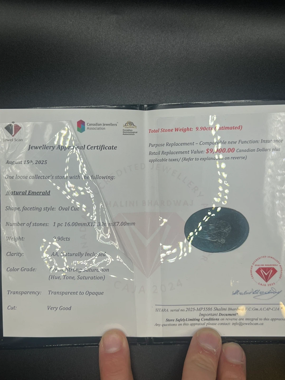 75Selling a natural emerald, oval cut, with a weight of 9.90 carats (estimated). The stone has a green, strong saturation colour grade and transparent to opaque transparency. It's a beautiful collector's stone!