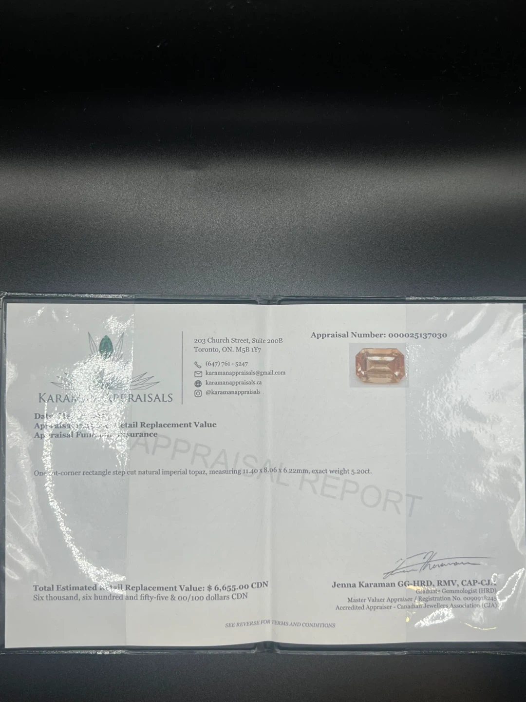 Selling a natural imperial topaz. It's a one-cut corner rectangle step cut, measuring 11.40 x 5.06 x 6.22mm and weighs 5.20ct. The appraisal report estimates the retail replacement value at $6,655.00 CDN