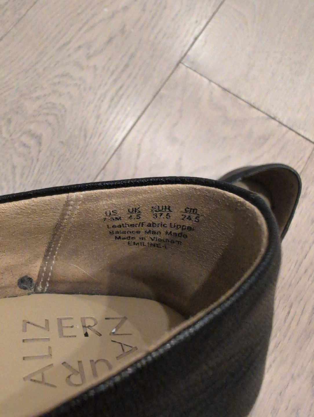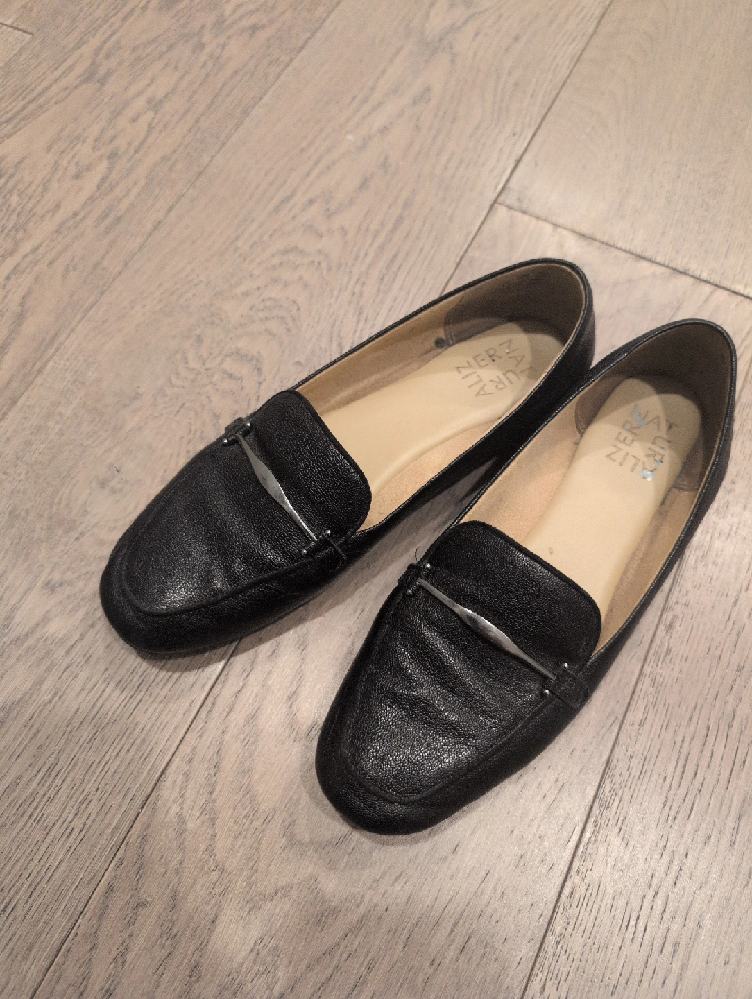Selling a pair of Naturalizer Aliz loafers in black leather. They are a size 7.5. These stylish and comfortable loafers are perfect for any occasion!