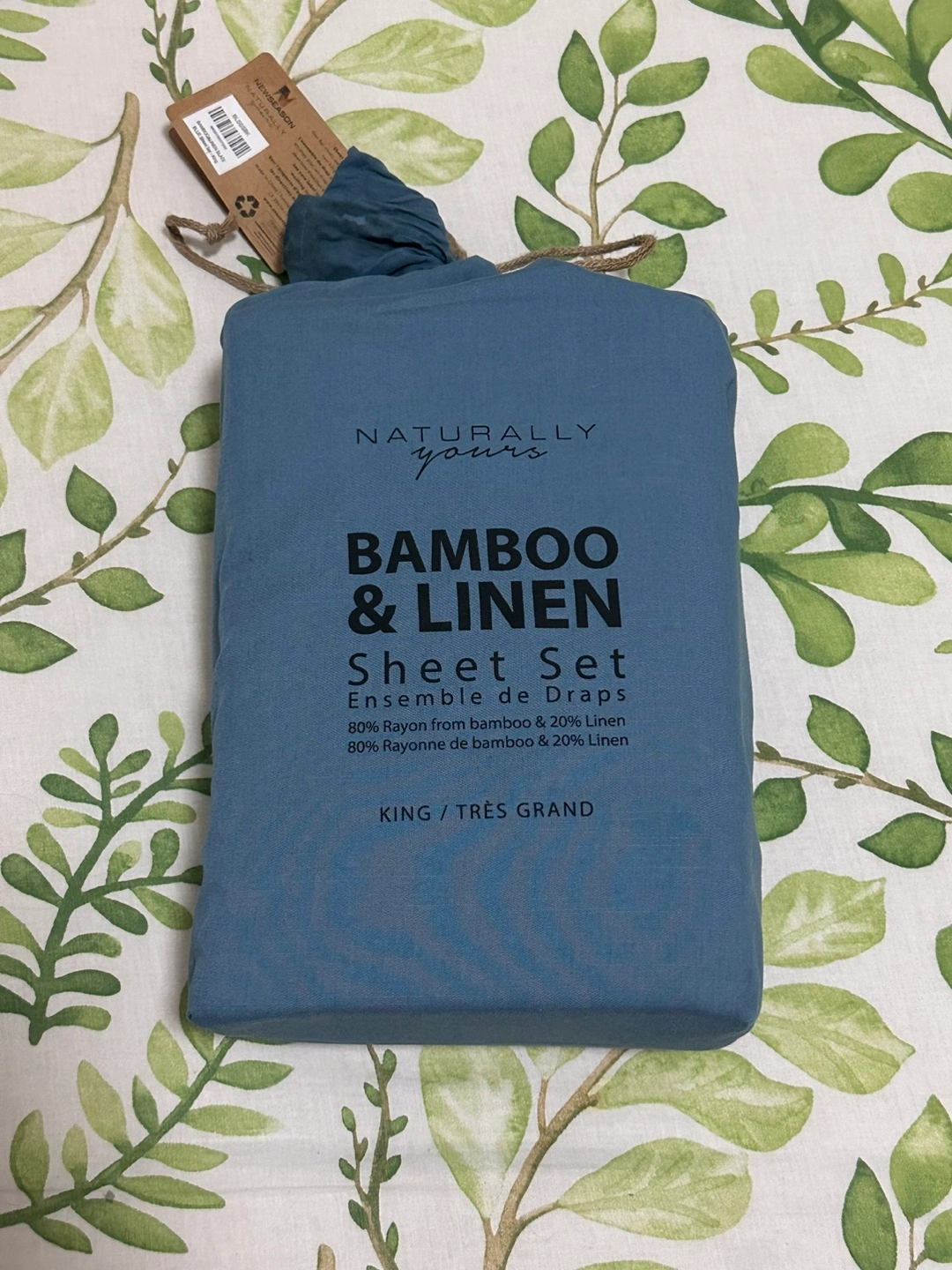 15Gorgeous king size bedsheet set in a calming slate blue, made from a soft, breathable blend of 80% rayon from bamboo and 20% linen. Unused and super comfortable — perfect for warmer nights or year-round luxury. Set includes: * 1 Fitted Sheet * 1 Flat Sheet * 2 Standard/King Pillowcases Details: * Brand new, never used * Slight washable stain in one top corner of the flat sheet (see photo – price reflects this) * Naturally cooling, moisture-wicking material * Elegant, neutral color that suits most décor * From a clean, smoke-free, pet-free home Selling for $65 – a steal for bamboo-linen! Message me with any questions or to arrange pickup.