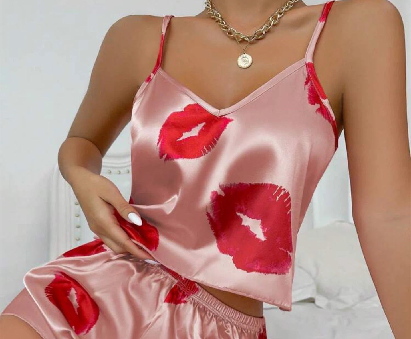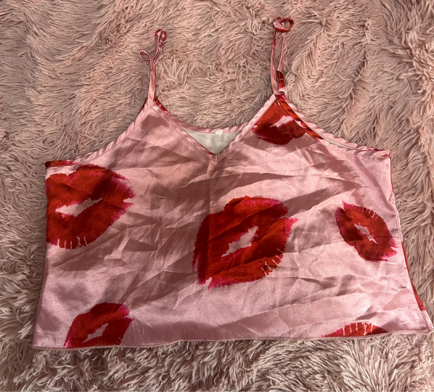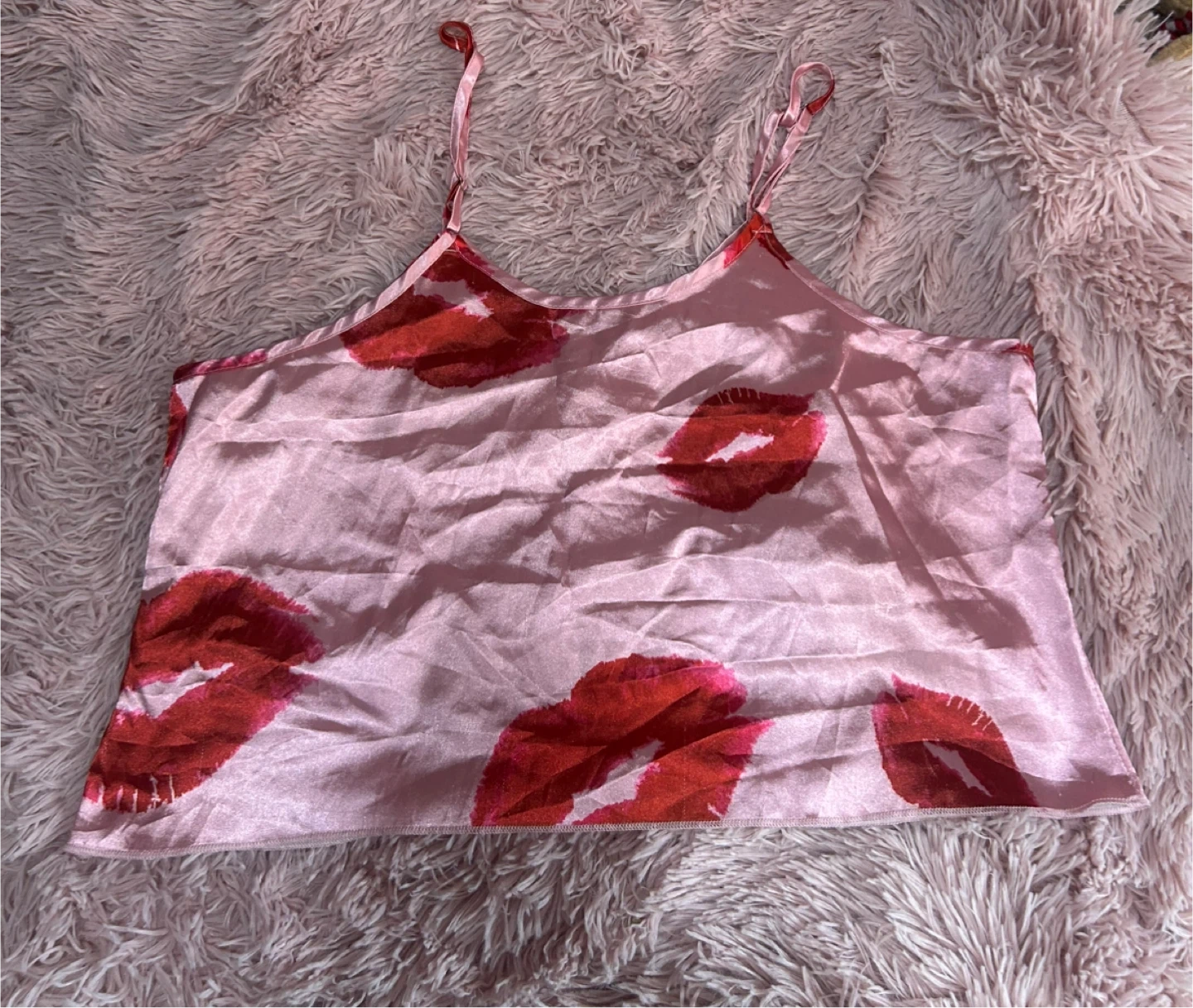This is a satin cami top featuring a bold red lips print on a light pink background. It has adjustable spaghetti straps for a comfortable fit. Perfect for lounging or as a cute sleepwear piece!