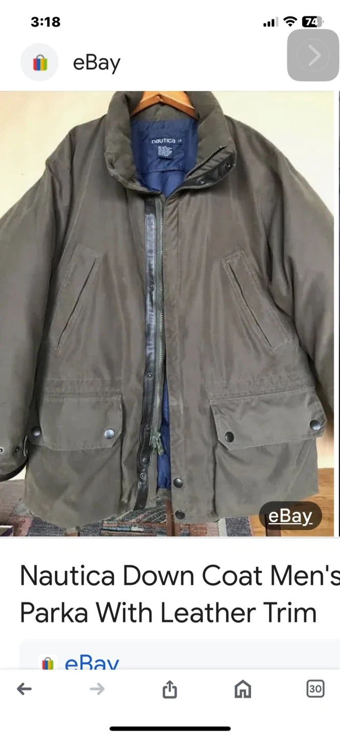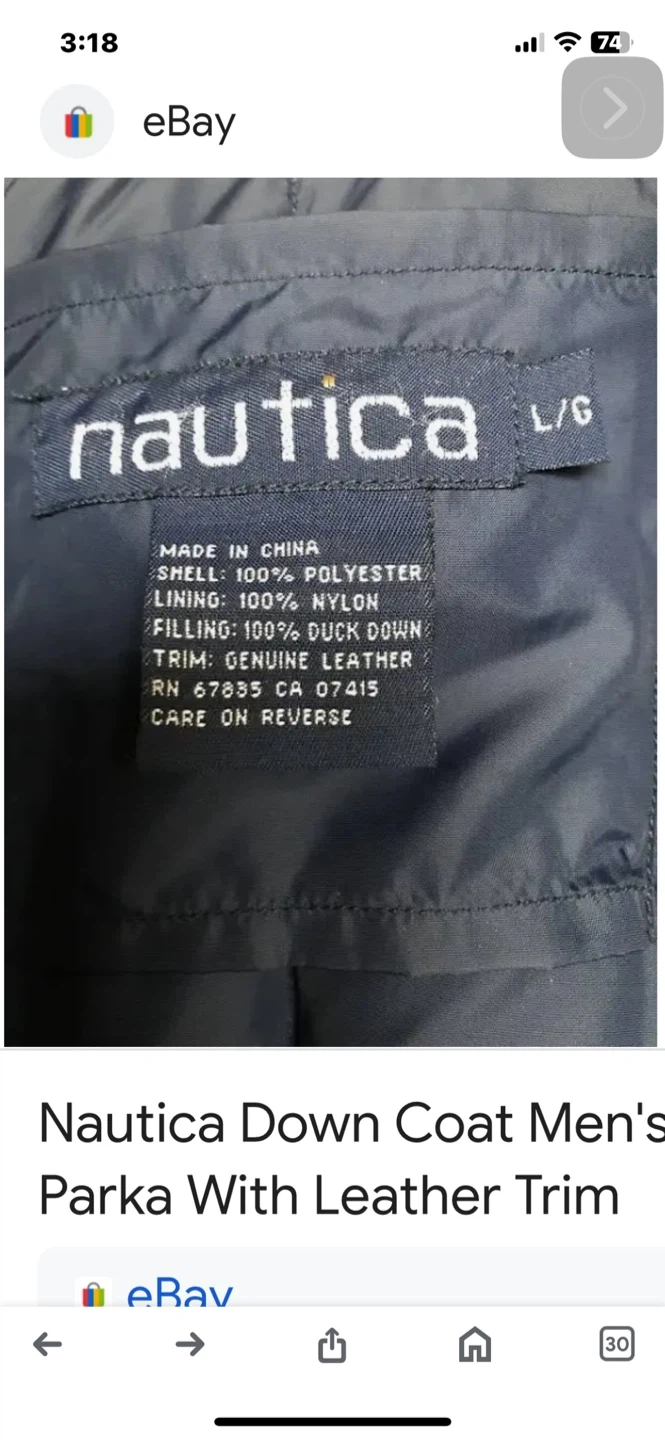 Nautica down coat men's parka with leather trim in size L/G. The shell is 100% polyester, the lining is 100% nylon, the filling is 100% duck down, and the trim is genuine leather