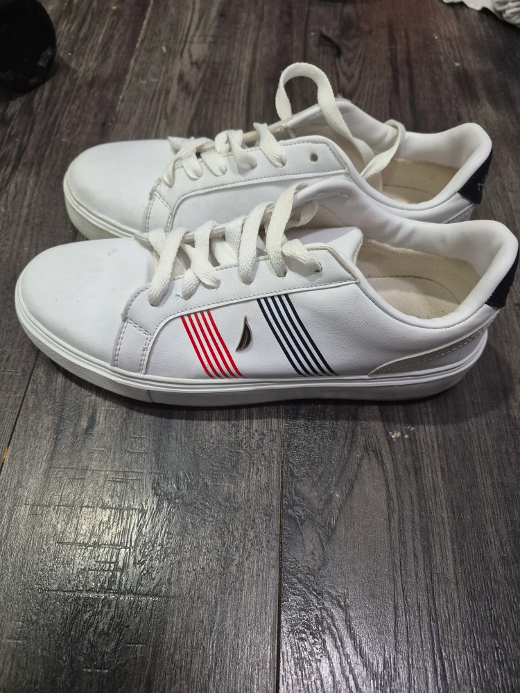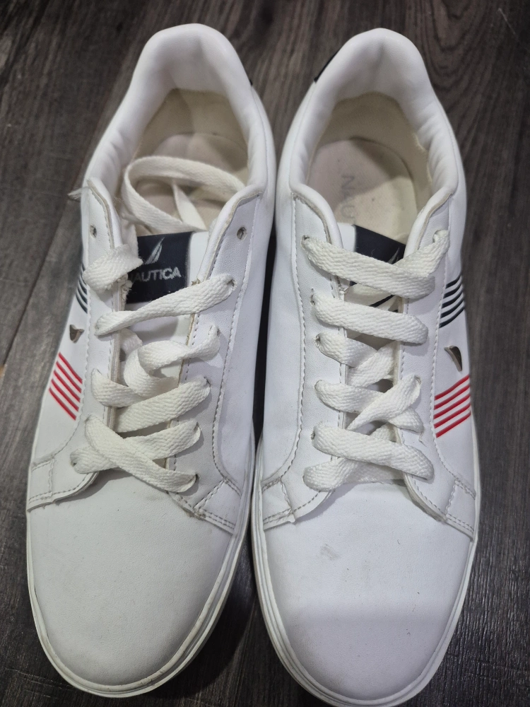 Selling a pair of white Nautica sneakers. They're in good condition and have a stylish design with red and navy stripes. Great for casual wear!