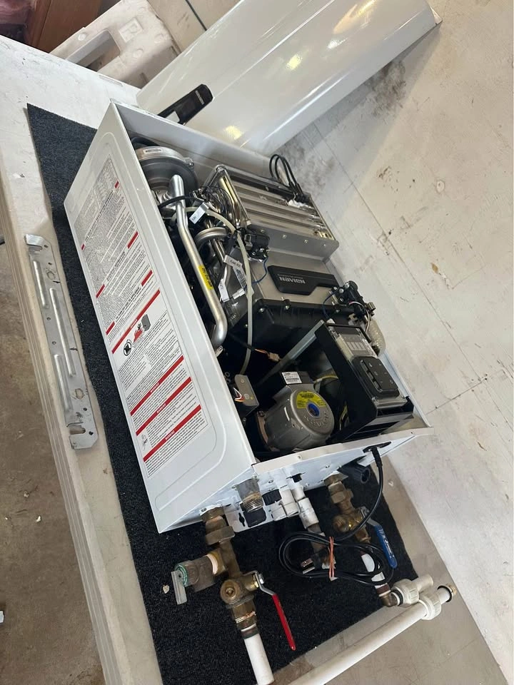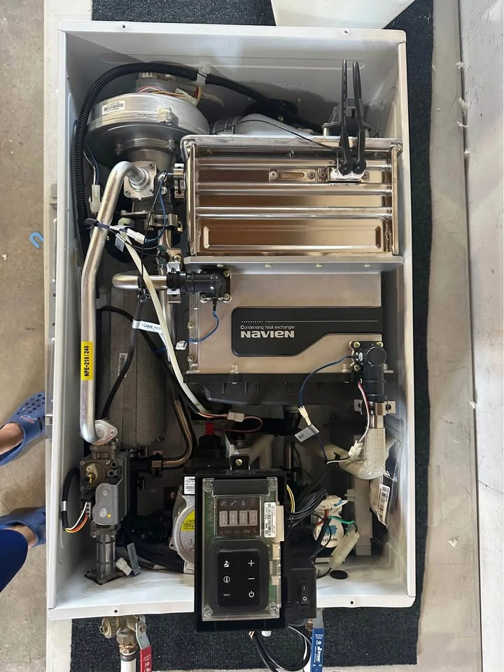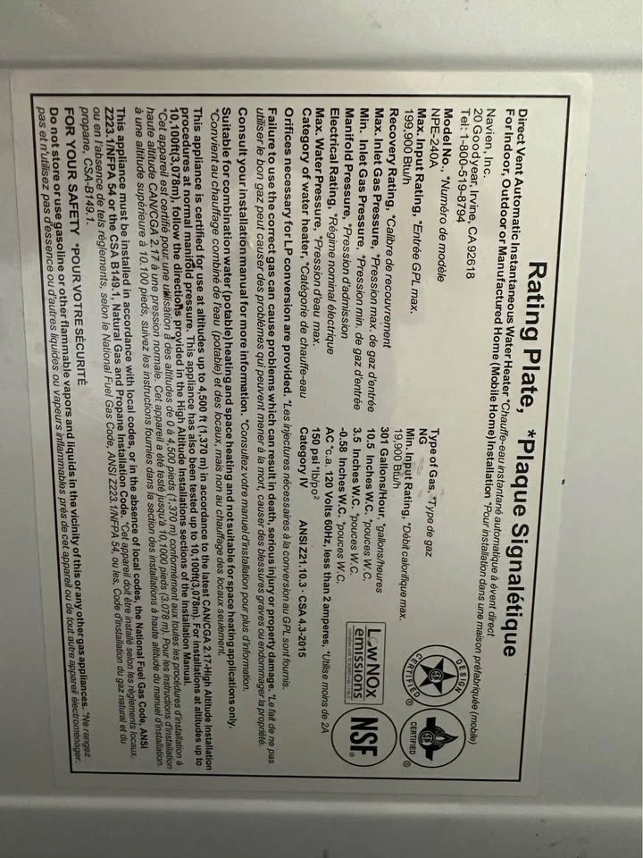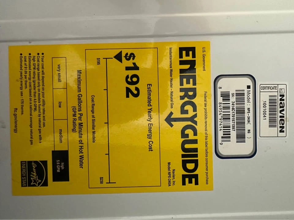 High-Efficiency Condensing Tankless Heater Brand: Navian Model: NPE- 210A Natural Gas MINT CONDITION only a couple years old. Professionally removed from a home demolition. High-efficiency tankless design – endless hot water, compact, and reliable. Specifications: • 180,000 BTU/H max input • Up to 10.1 GPM flow rate • 0.95 UEF efficiency rating (super energy efficient) • Natural Gas (convertible to propane) • Indoor or outdoor installation capable • Dual stainless steel heat exchangers for durability • ComfortFlow® technology with internal pump & buffer tank