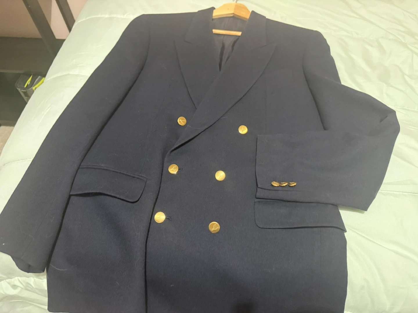 Selling a navy blue blazer. It's in good condition with gold buttons. Perfect for dressing up or down!