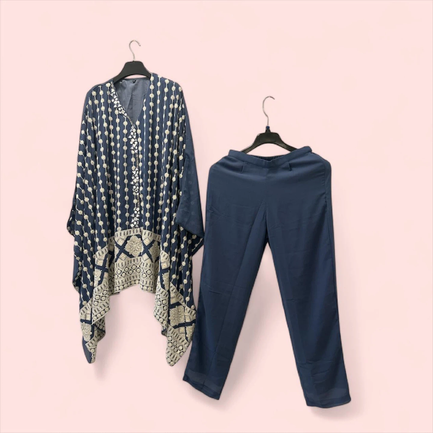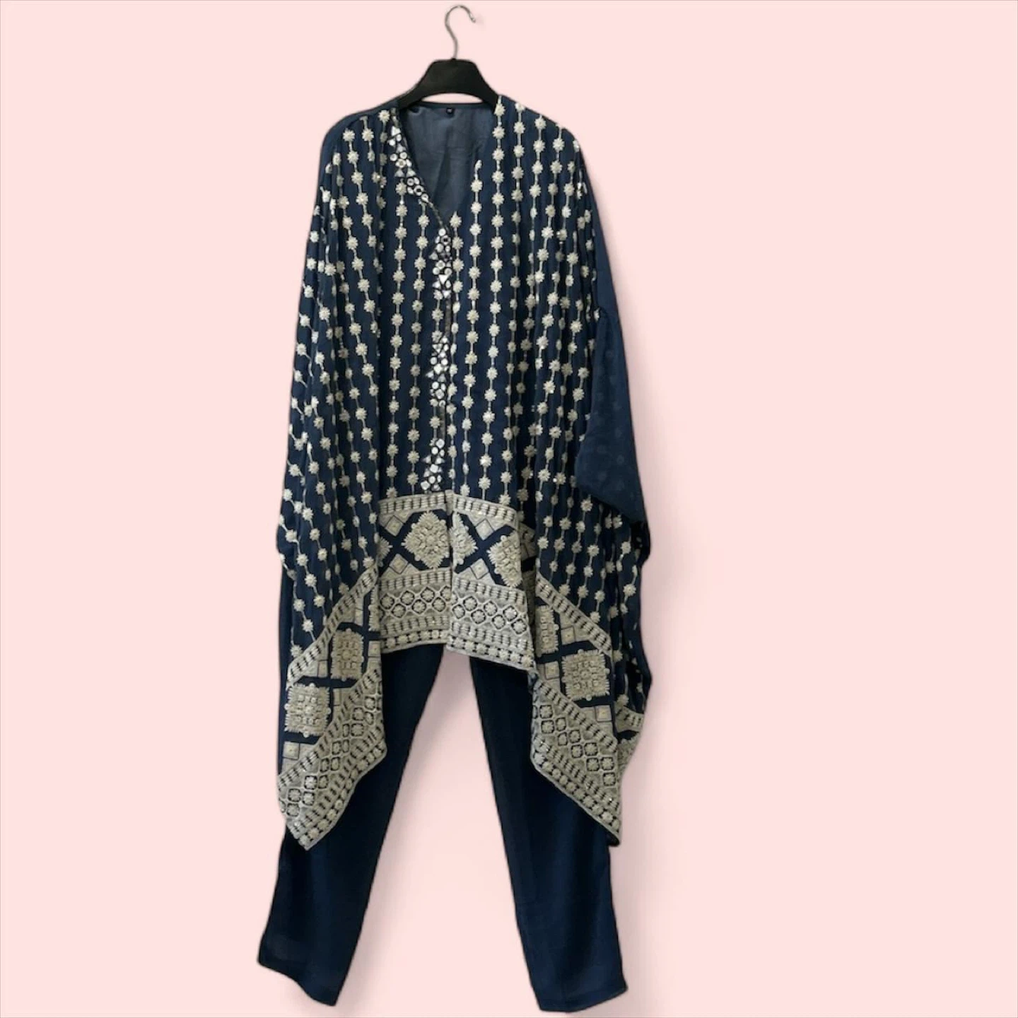 35Selling a beautiful navy blue two-piece outfit. The top features intricate embroidery, adding a touch of elegance. The set includes a stylish top and matching pants, perfect for a special occasion or a chic everyday look!
