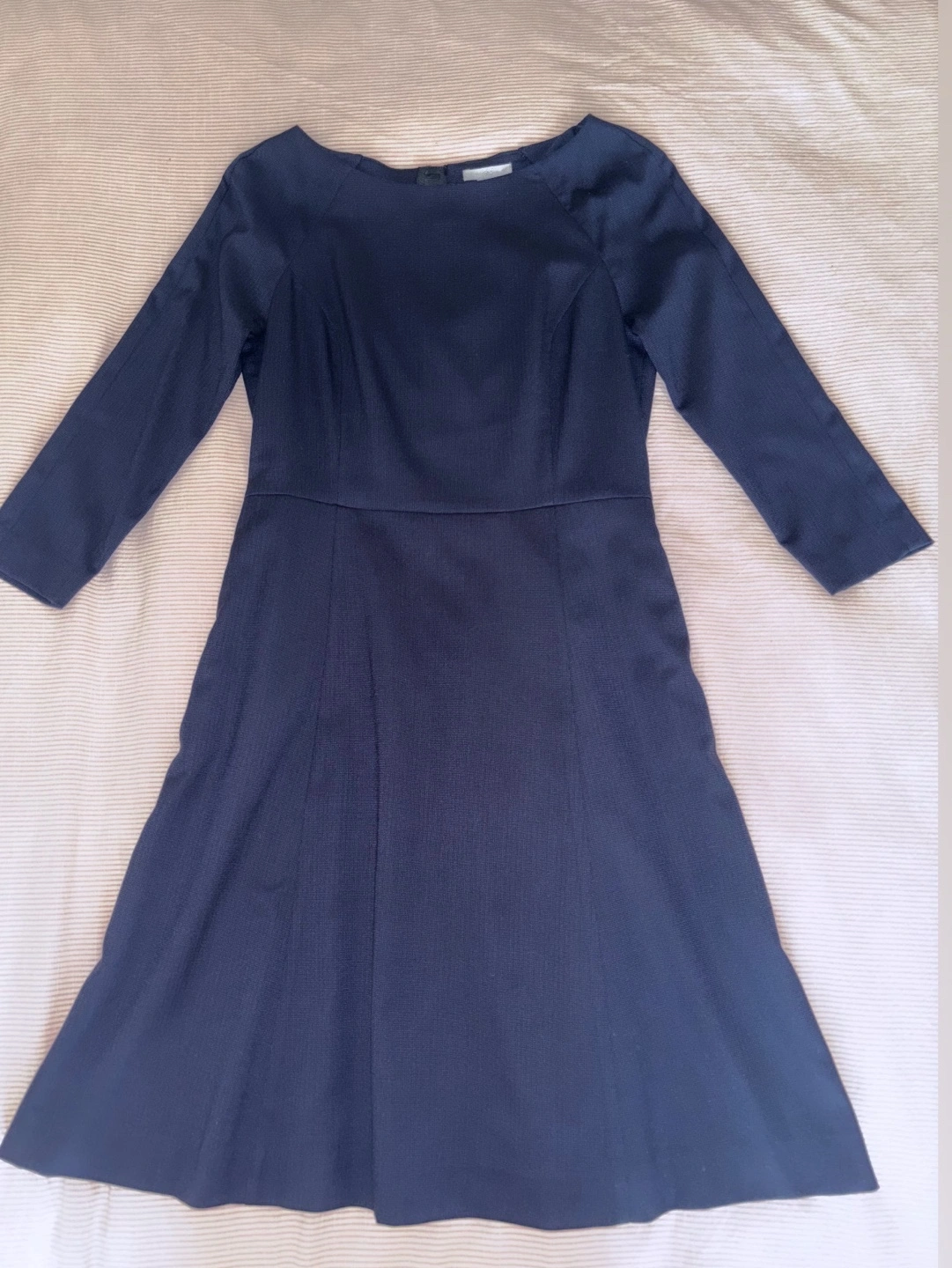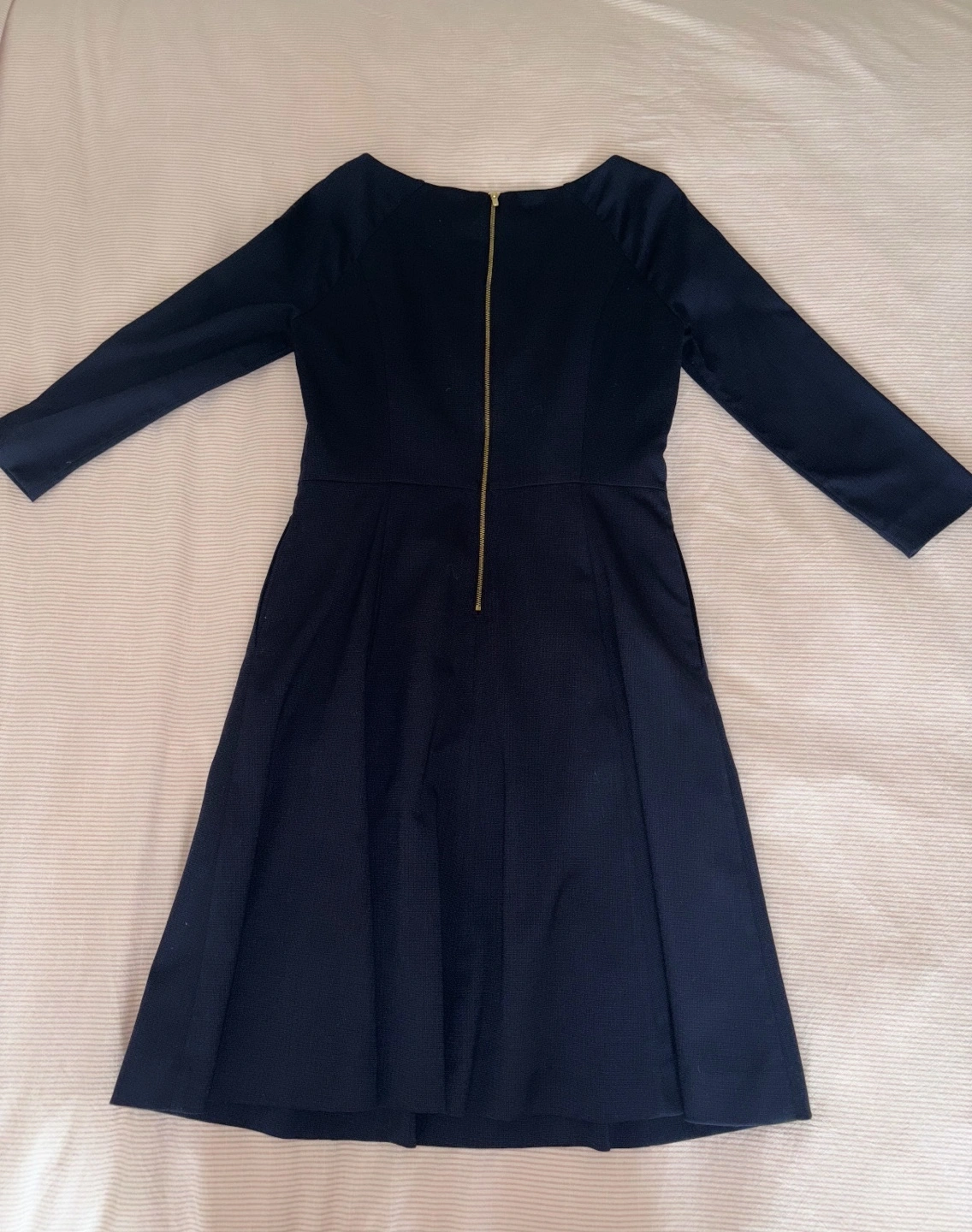 148A navy blue A-line dress with 3/4 sleeves. a gold zipper at the back. The dress is made of a stretchy material. Good for winter !