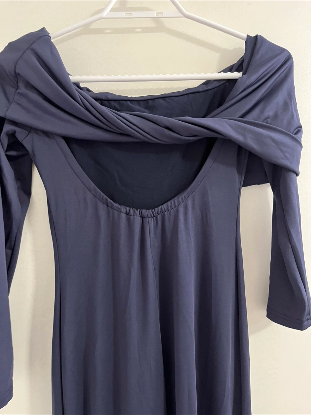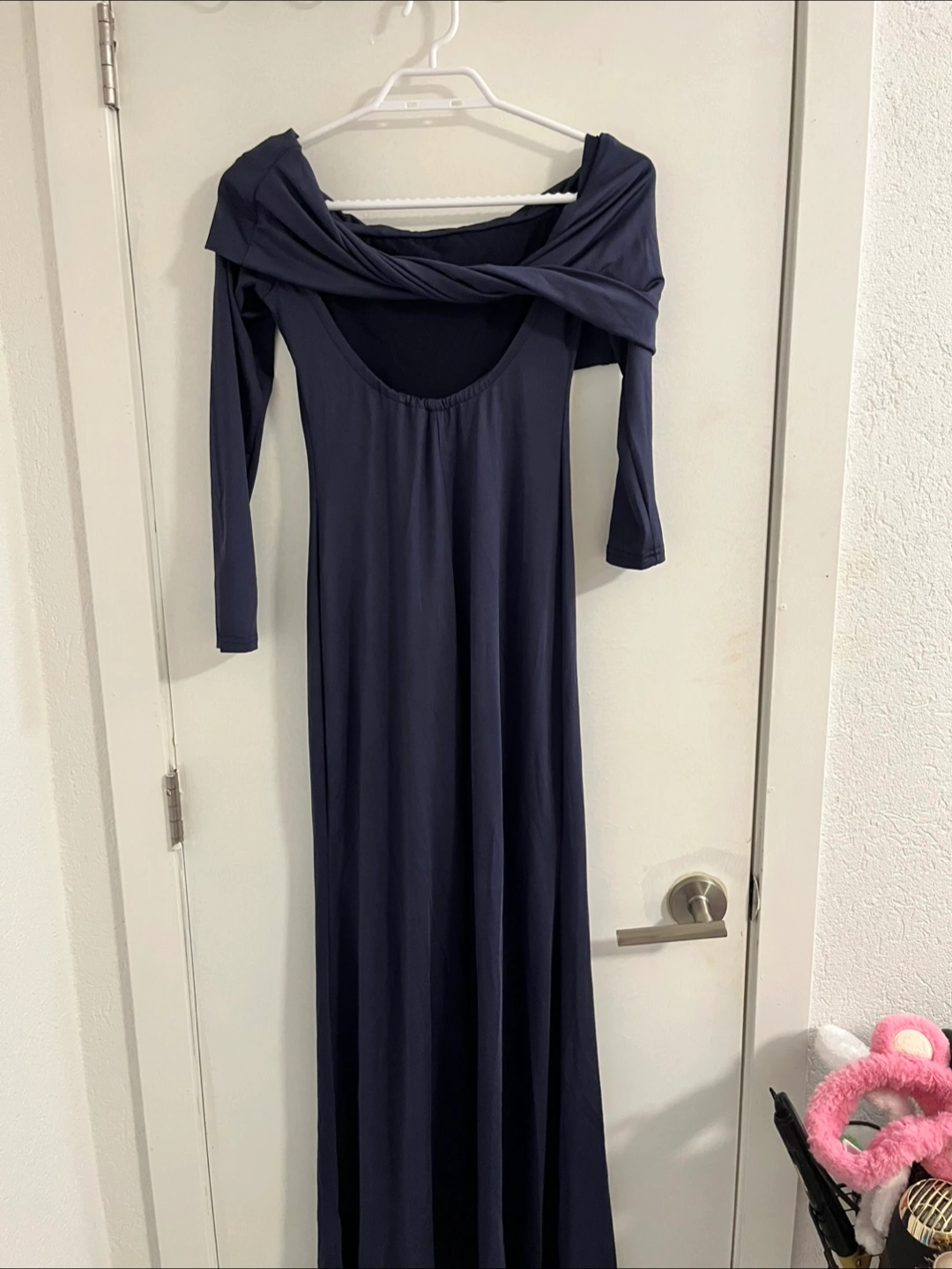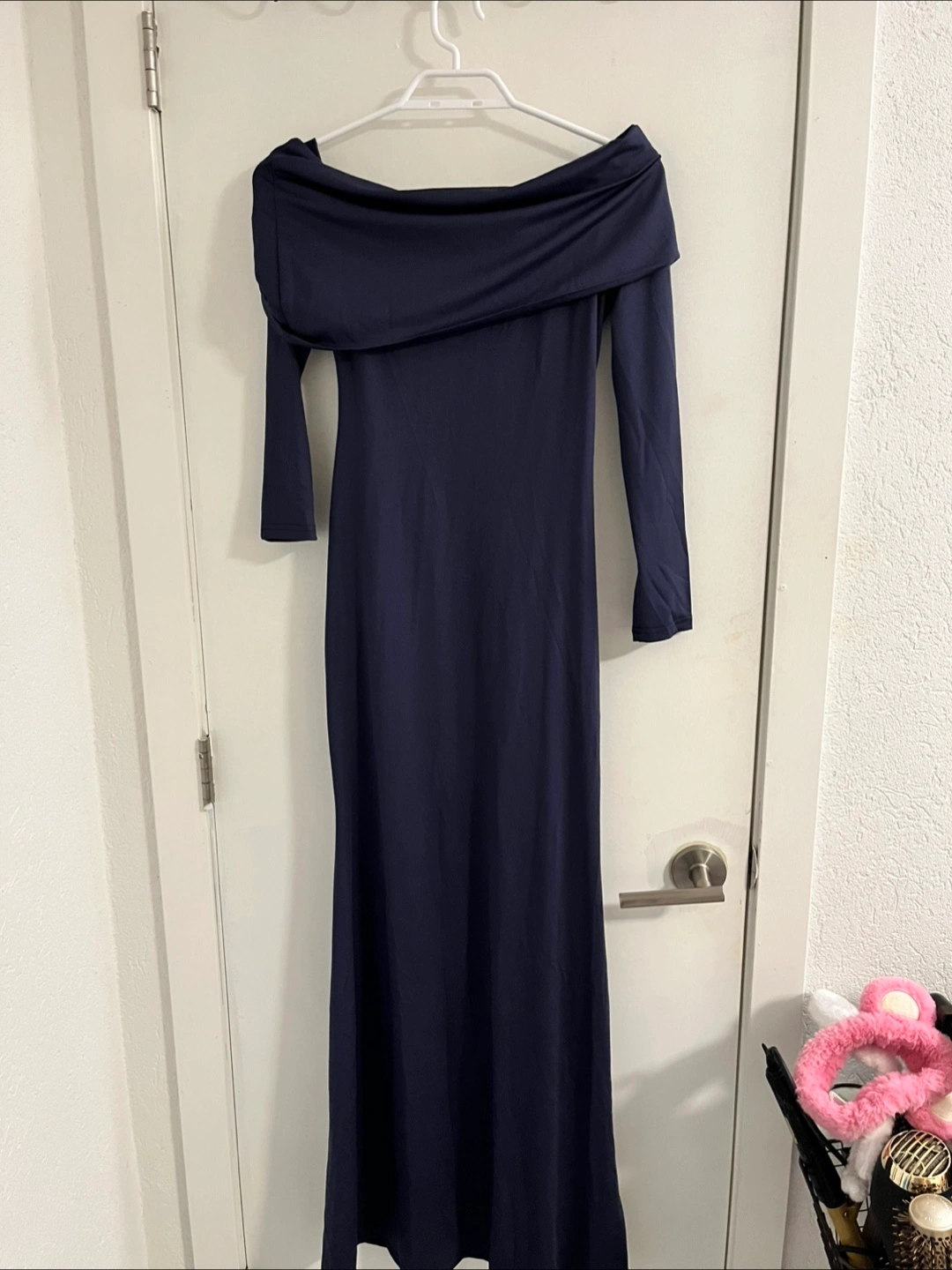 A navy blue off-shoulder maxi dress! It's in great condition and perfect for a night out or a special occasion. The material is soft and comfortable, making it a joy to wear