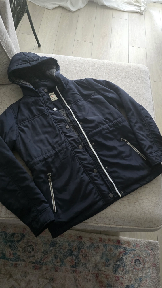 This is a navy blue padded jacket with a hood. It has a zipper and button closure, and the inside is lined with a soft, furry material. It's perfect for keeping warm on chilly days. Machine washable and great for upto 0°C