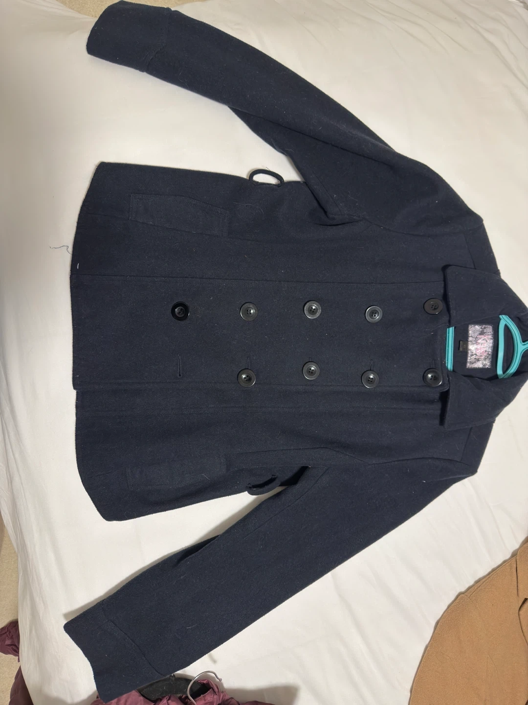 10Selling a navy blue pea coat. It's in great condition and ready for a new home! It's a classic style that will keep you warm and stylish during the colder months