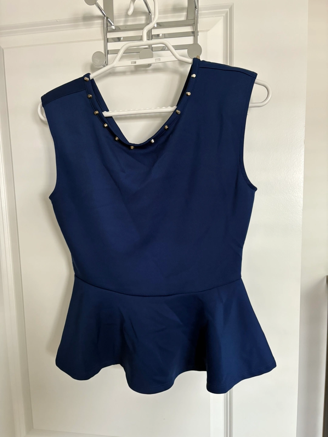 A stylish navy blue peplum top, perfect for dressing up or down! It features a flattering peplum silhouette and a V-neckline with stud detailing. In great condition and ready for a new home!