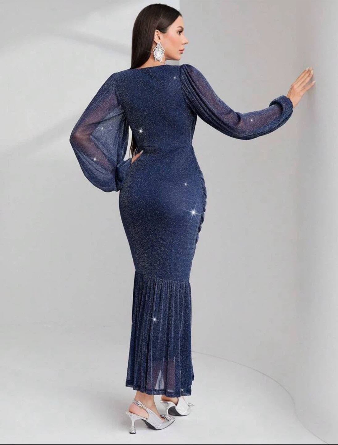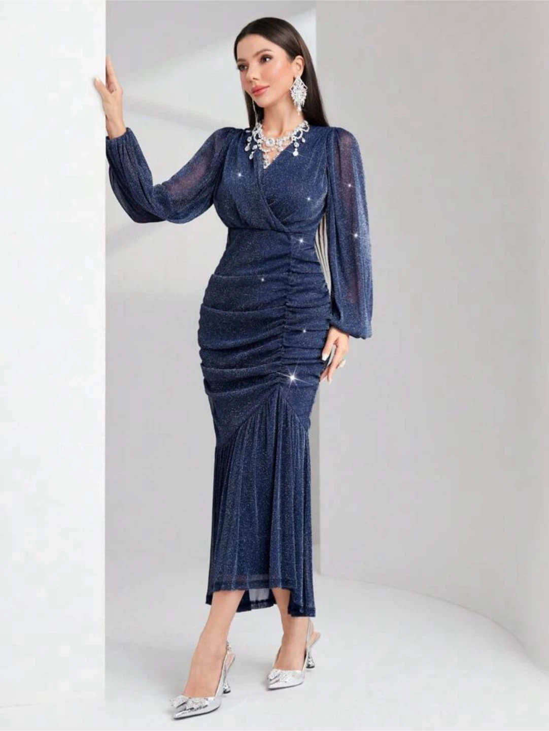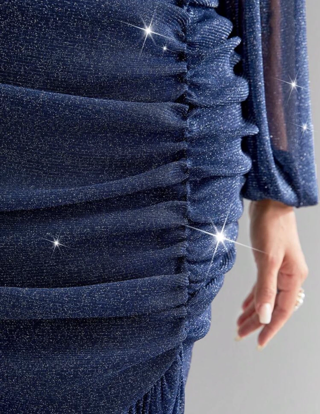 This is a beautiful navy blue ruched dress with long sleeves and a mermaid style bottom. It's perfect for a night out or a special occasion. The ruching detail is very flattering!