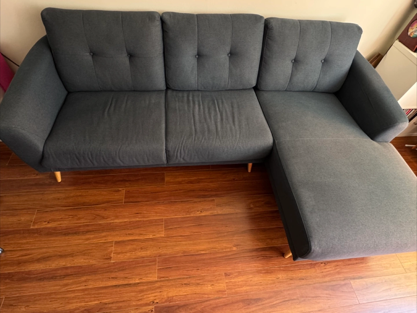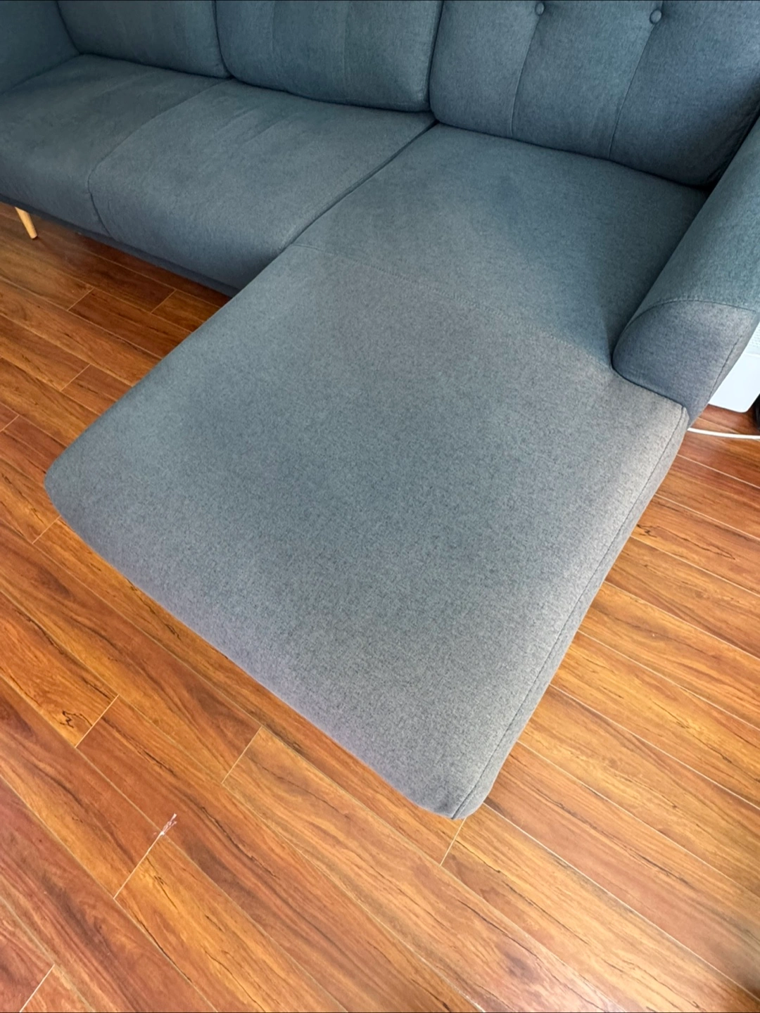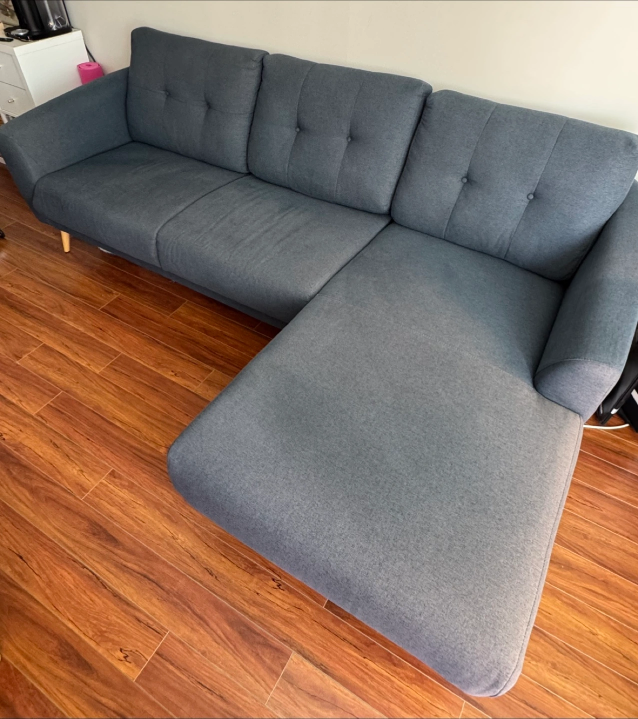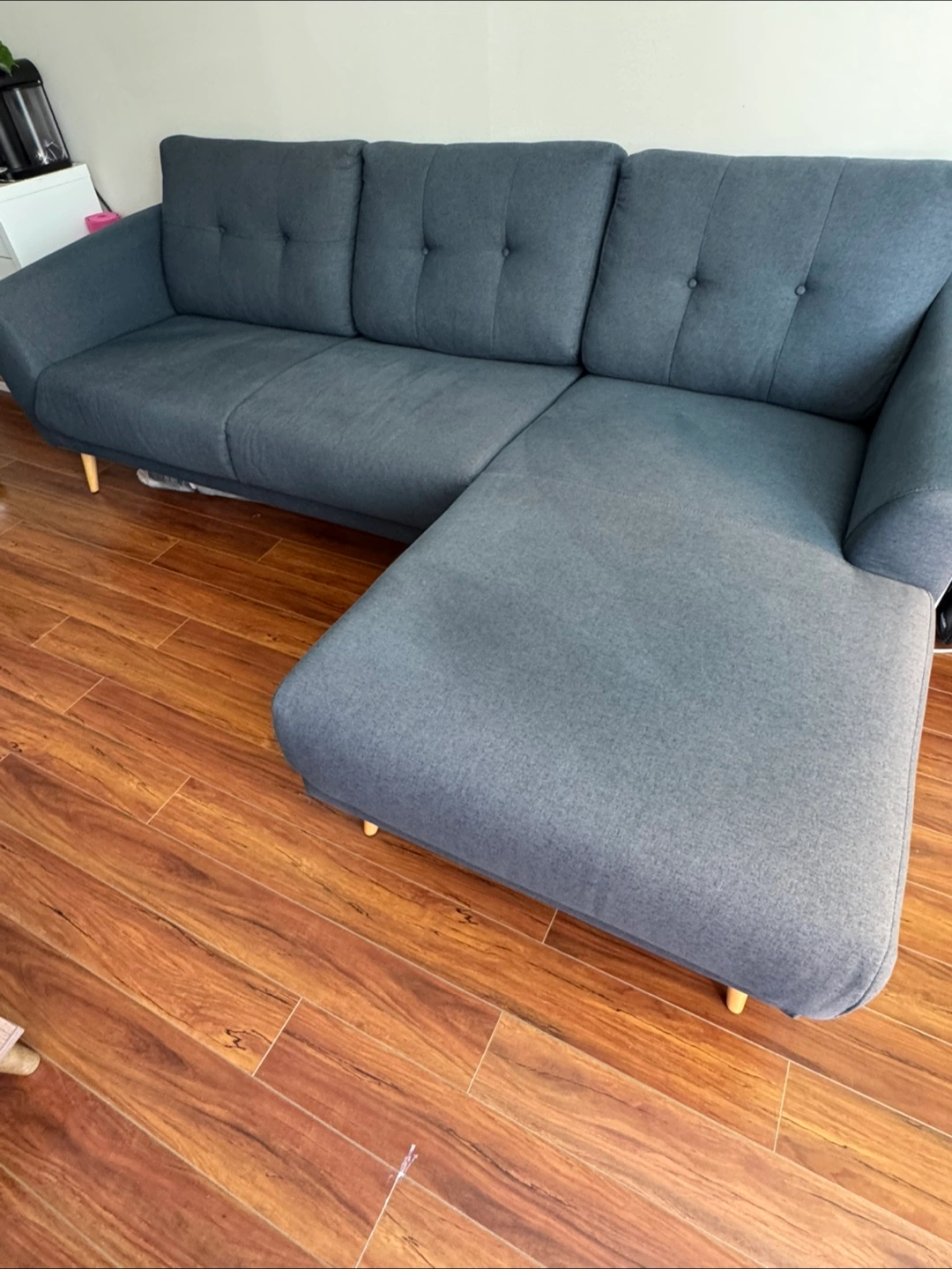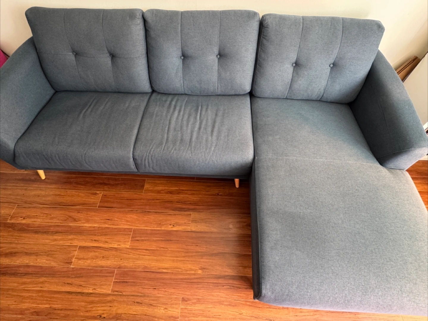Selling a comfy navy sectional sofa. It's in great shape and would be perfect for a living room. Slightly faded on one side due to sunlight. The sectional design offers plenty of seating and a cozy spot to relax after a long day! It's a great addition to any home.