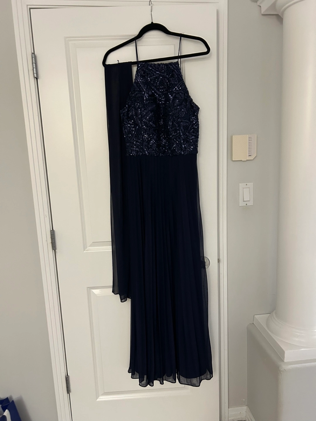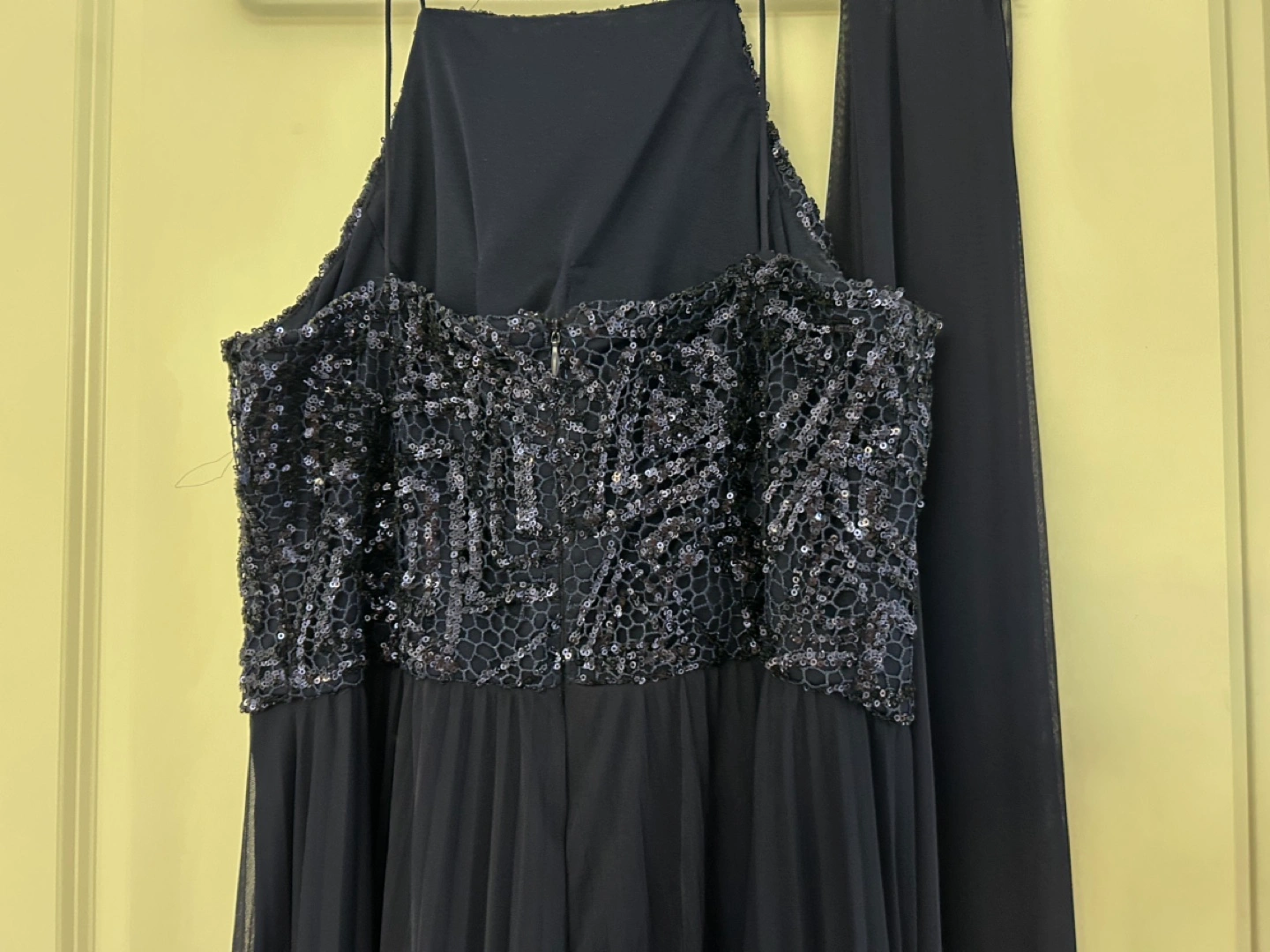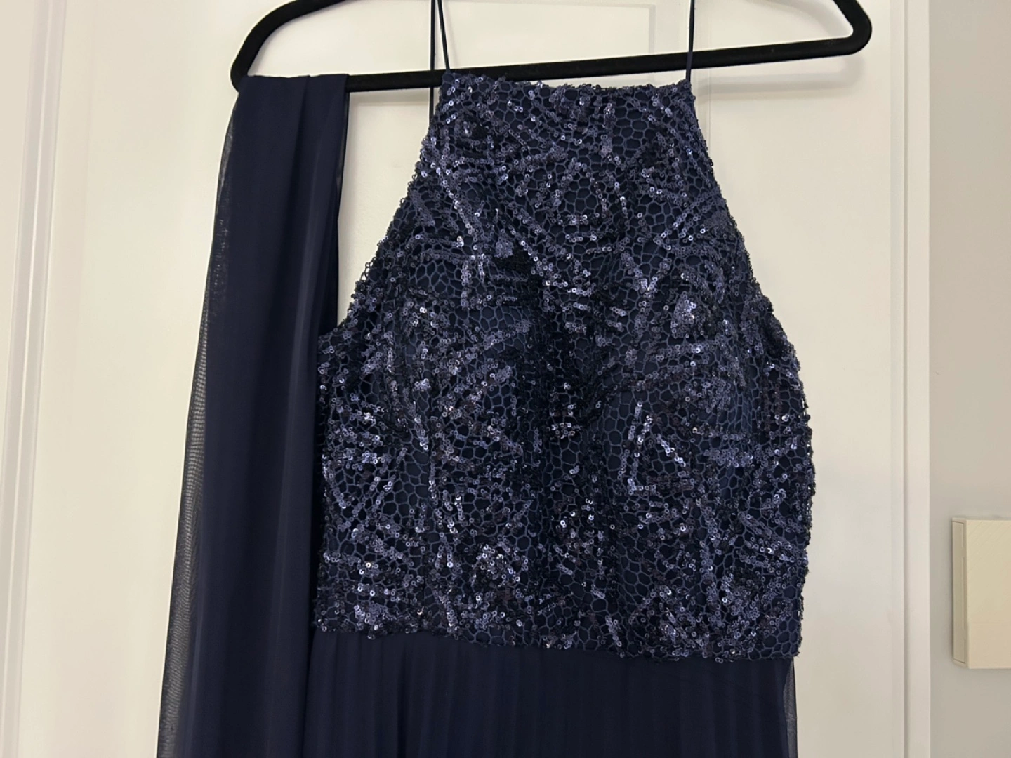 97Navy blue sequined halter dress with a flowy skirt. The bodice features a beautiful sequin design. Size 12 Bought from Melanie Lynn and worn only once. Comes with sheer scarf/wrap.