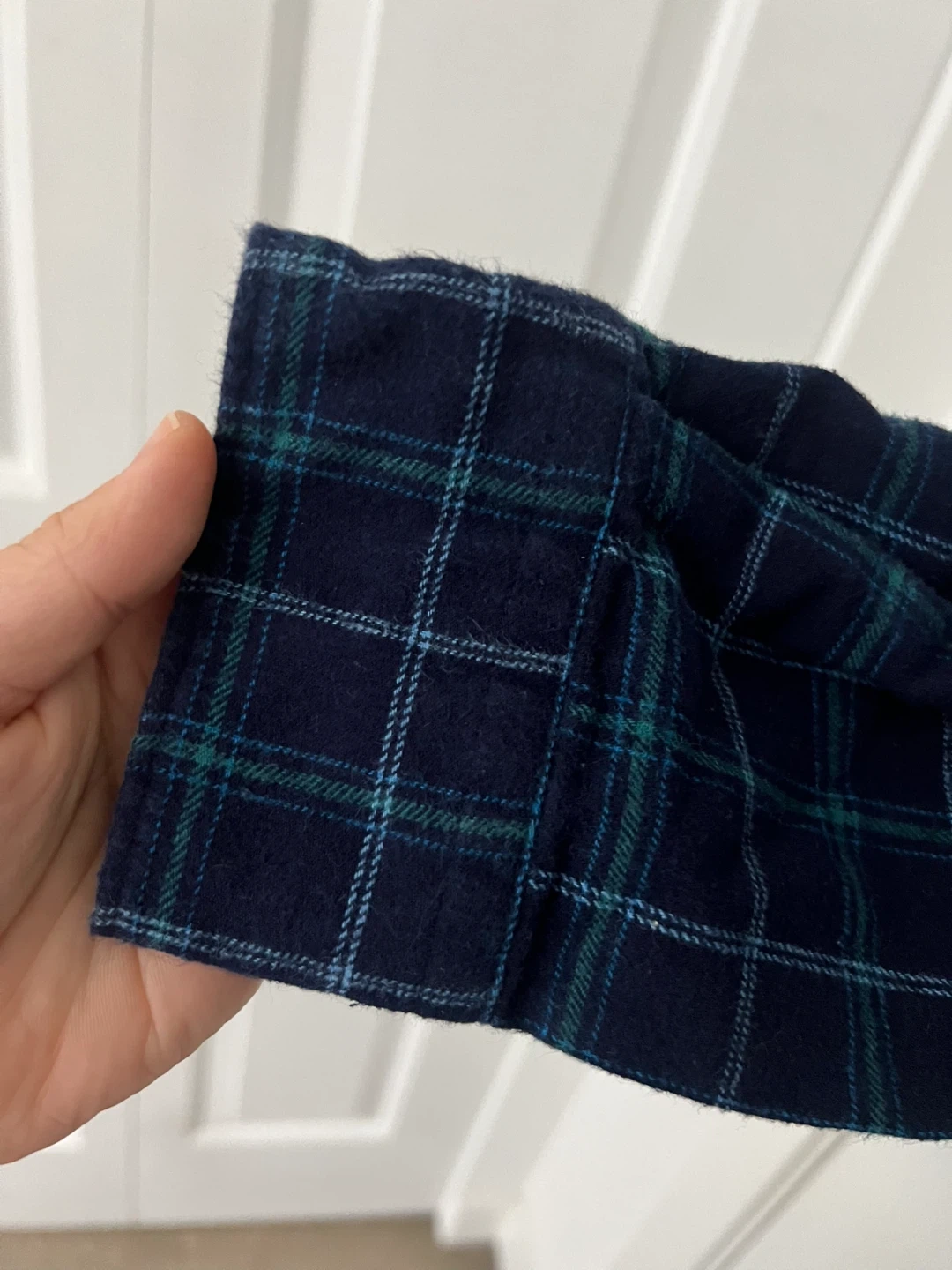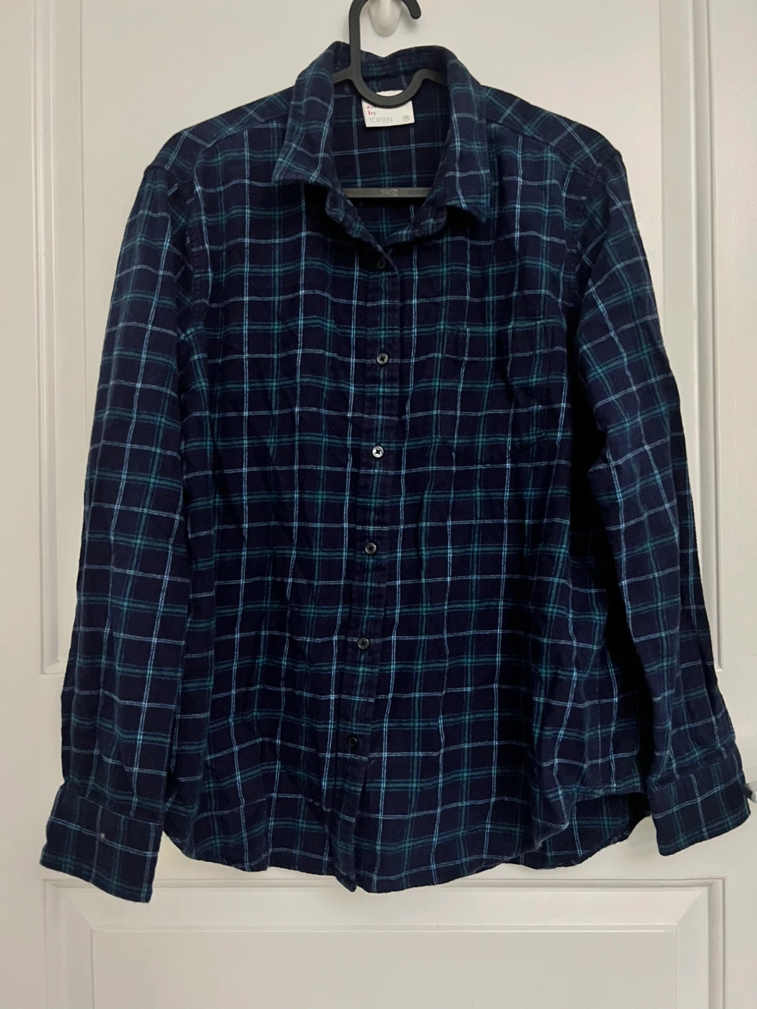 108A comfy navy blue flannel shirt. It features a classic plaid pattern and is perfect for layering or wearing on its own. New product. Never used it.