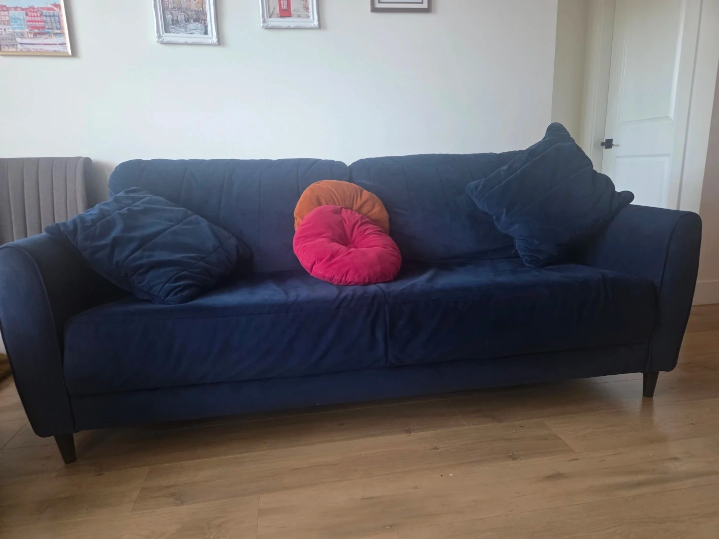 Selling a comfy navy blue sofa! It's in great shape and would be a lovely addition to any living room. Perfect for lounging and relaxing after a long day. The pillows are included!
