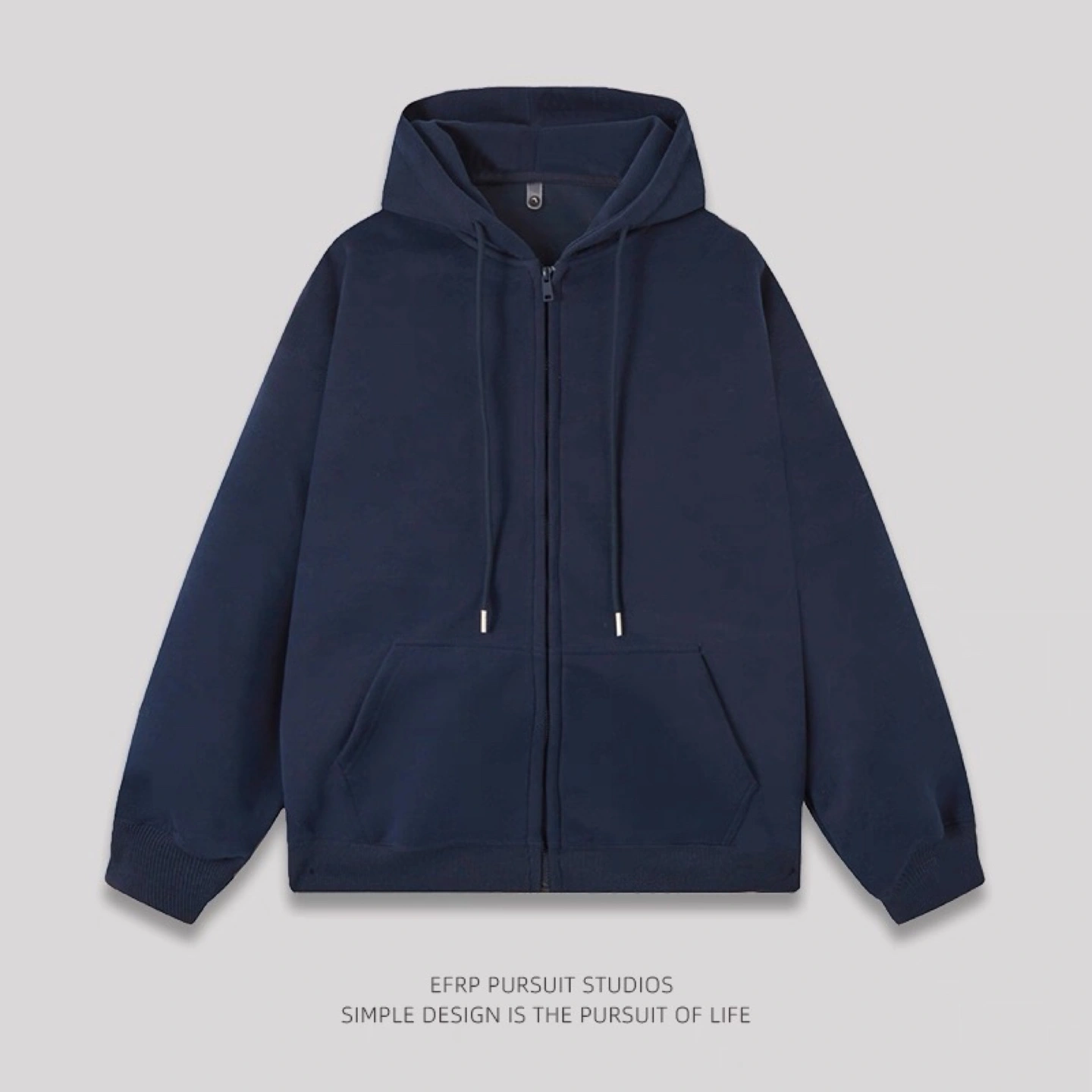 94Here's a navy blue zip-up hoodie! It's a simple design that's great for everyday wear. Perfect for layering or just lounging around the house