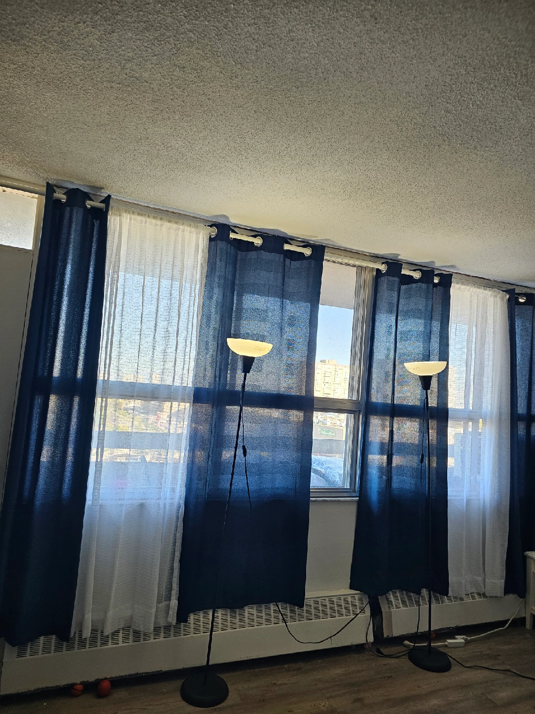 I'm selling a set of navy and white curtains. They're in great condition and would look great in any room. Two lamps as well. They are a simple way to add a touch of elegance to your home! 8 pieces total