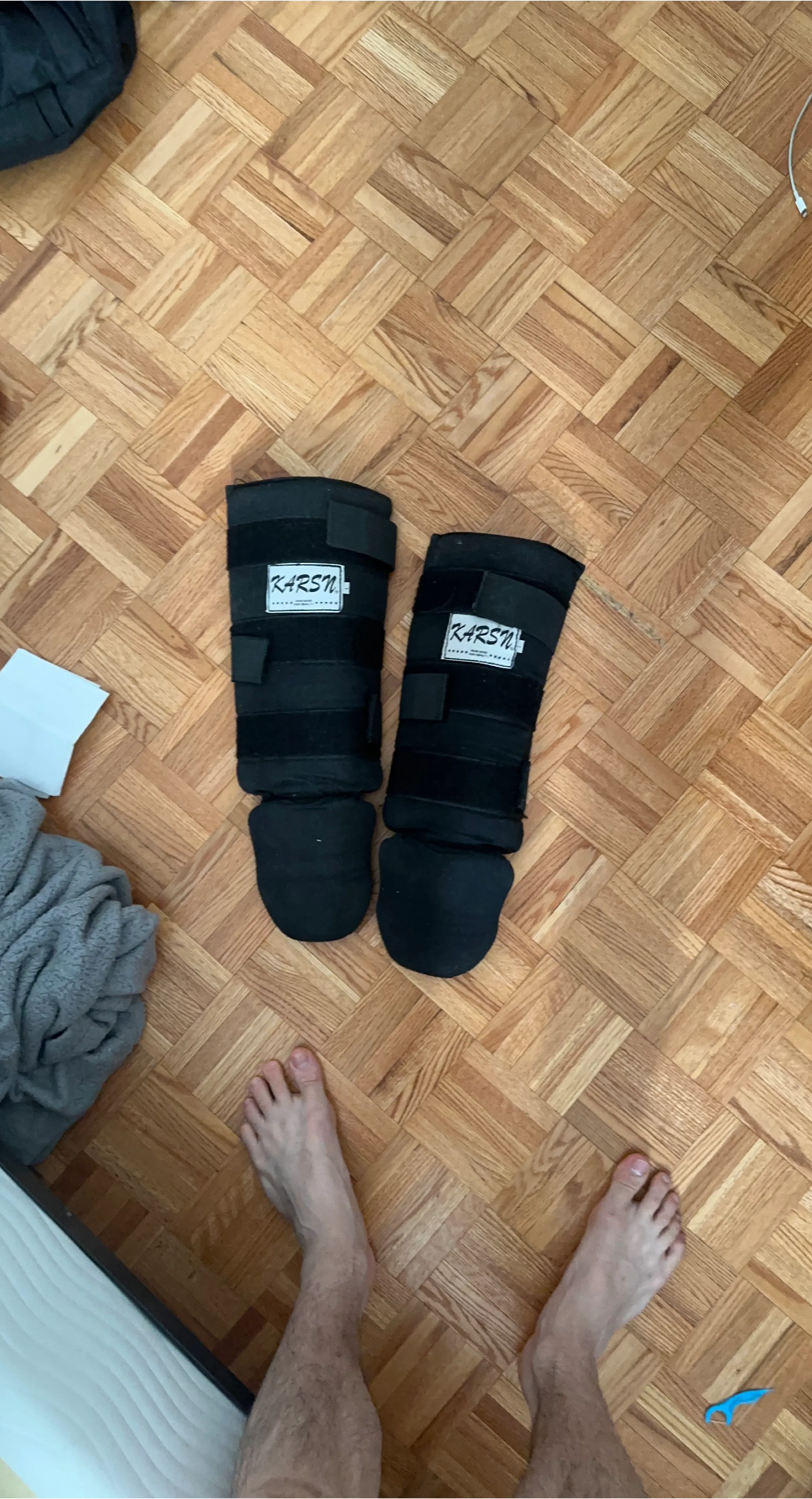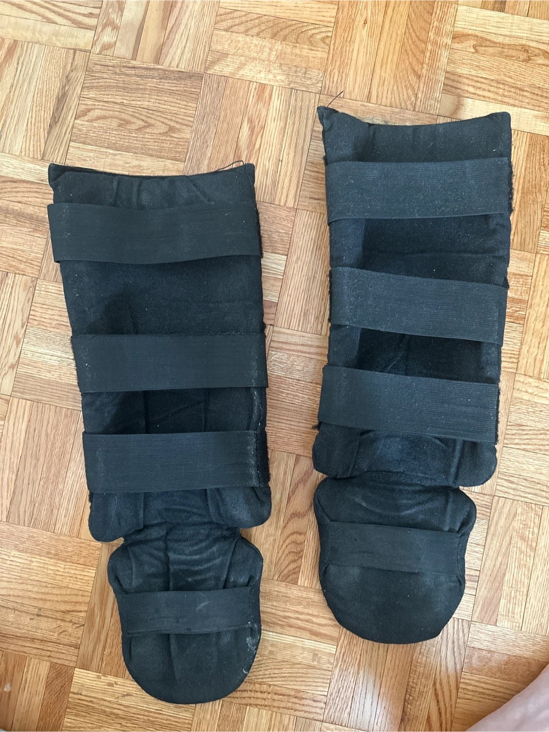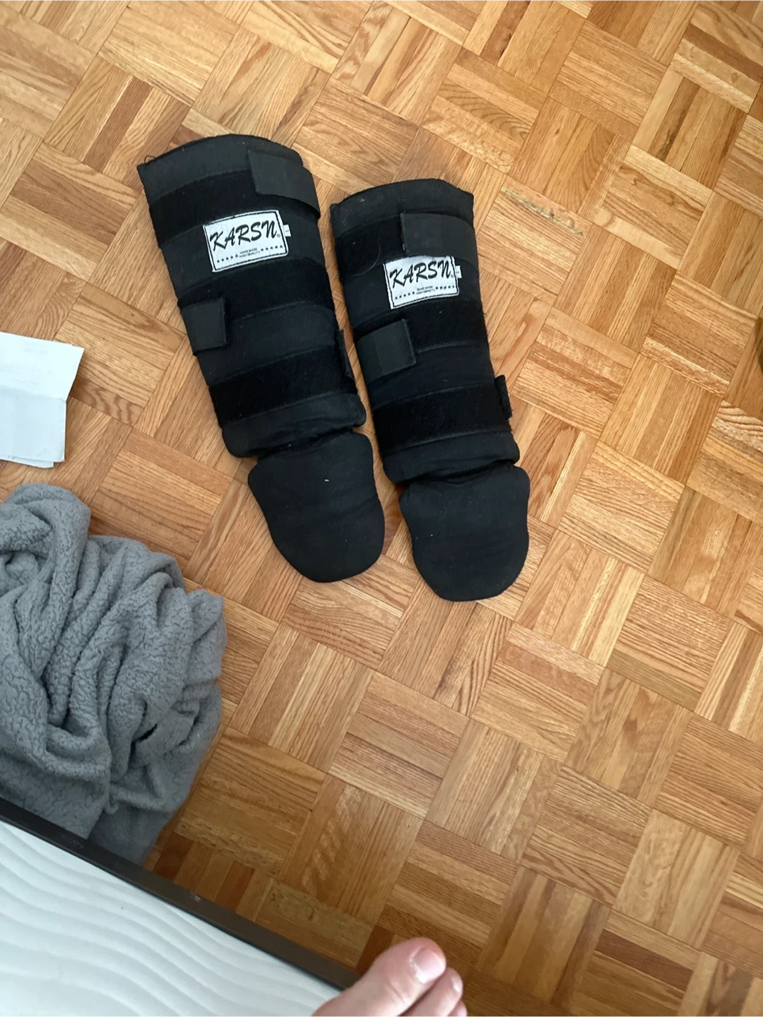 A pair of black padded shin guards from KARSN. They feature adjustable straps for a secure fit. These guards offer protection for sports or activities requiring impact absorption. I wore them only a couple times, because I had a gift which were also shin guard and I liked them more. Most of the time they were just laying in the corner. Finally, I decided to sell it, to the person for who it can be useful