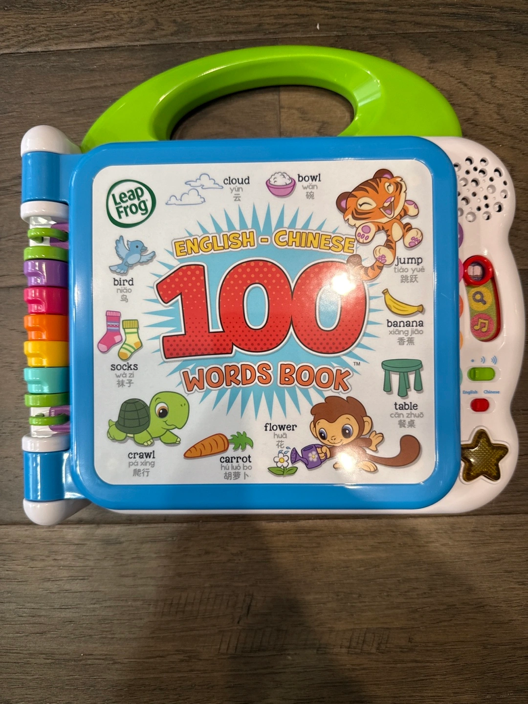 This is a LeapFrog 100 Words Book that teaches in both English and Chinese! It features words like cloud, bowl, bird, socks, banana, table, crawl, carrot, and flower. Great for early learning! Cash and pick up.