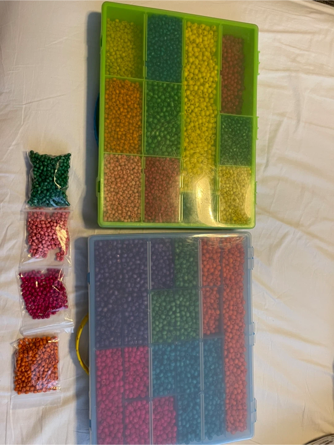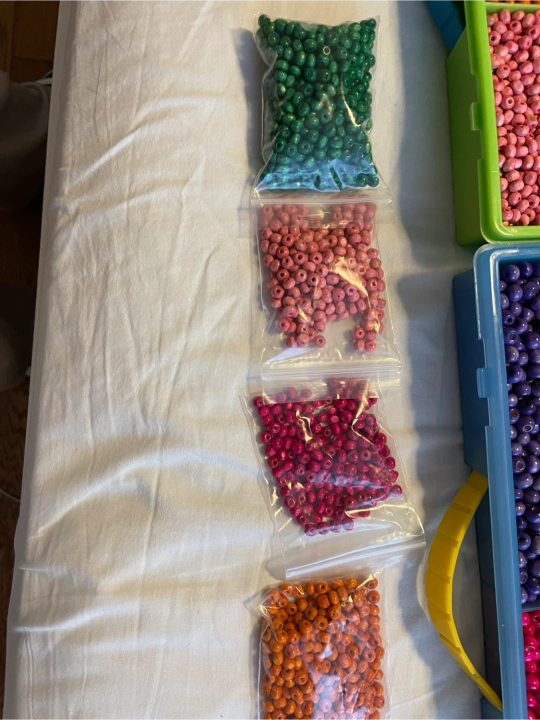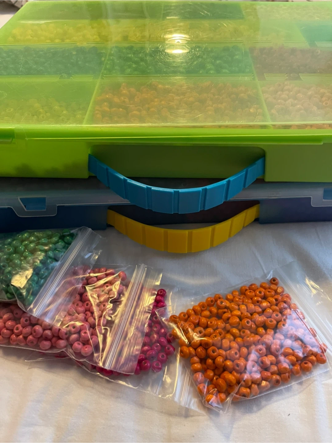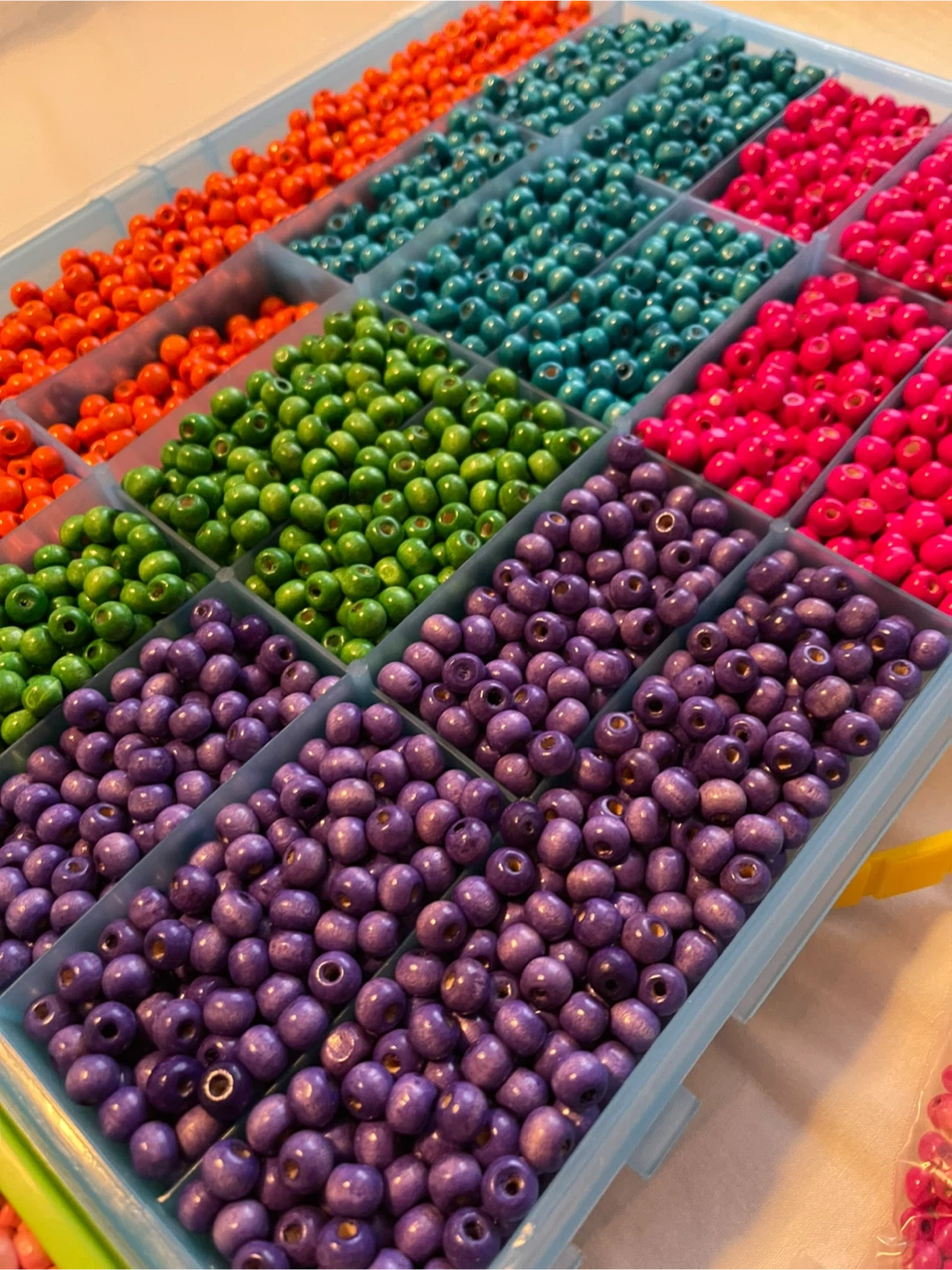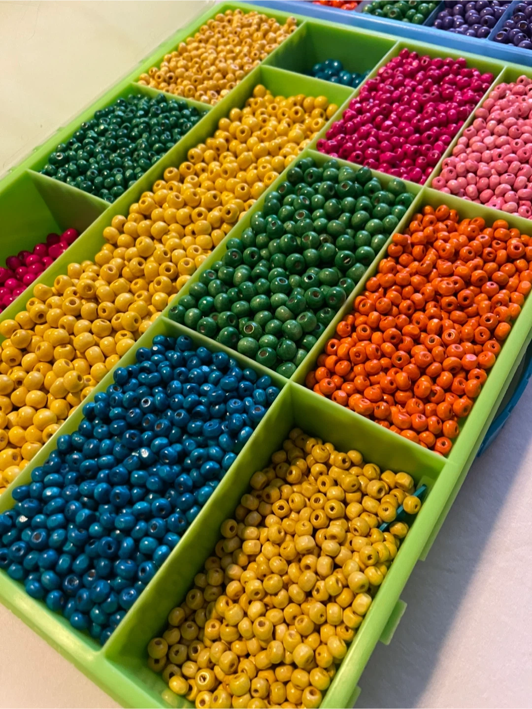 A large assortment of colourful wooden beads for crafting projects. Includes multiple colours like green, pink, orange, purple, blue, and yellow. Comes in two storage containers with various compartments for organization.