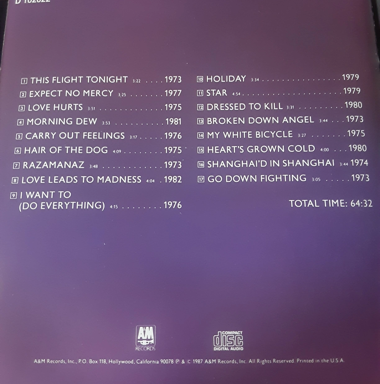 51Selling a Nazareth Classics Volume 16 CD. It includes the songs: - This Flight Tonight - Expect No Mercy - Love Hurts - Morning Dew - Carry Out Feelings - Hair of the Dog - Razamanaz - Love Leads to Madness - I Want To (Do Everything) - Holiday - Star - Dressed to Kill - Broken Down Angel - My White Bicycle - Heart's Grown Cold - Shanghai'd In Shanghai - Go Down Fighting