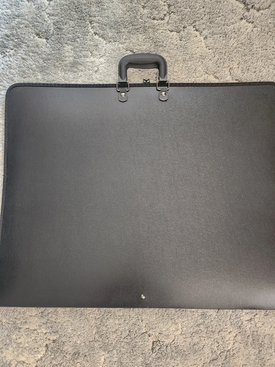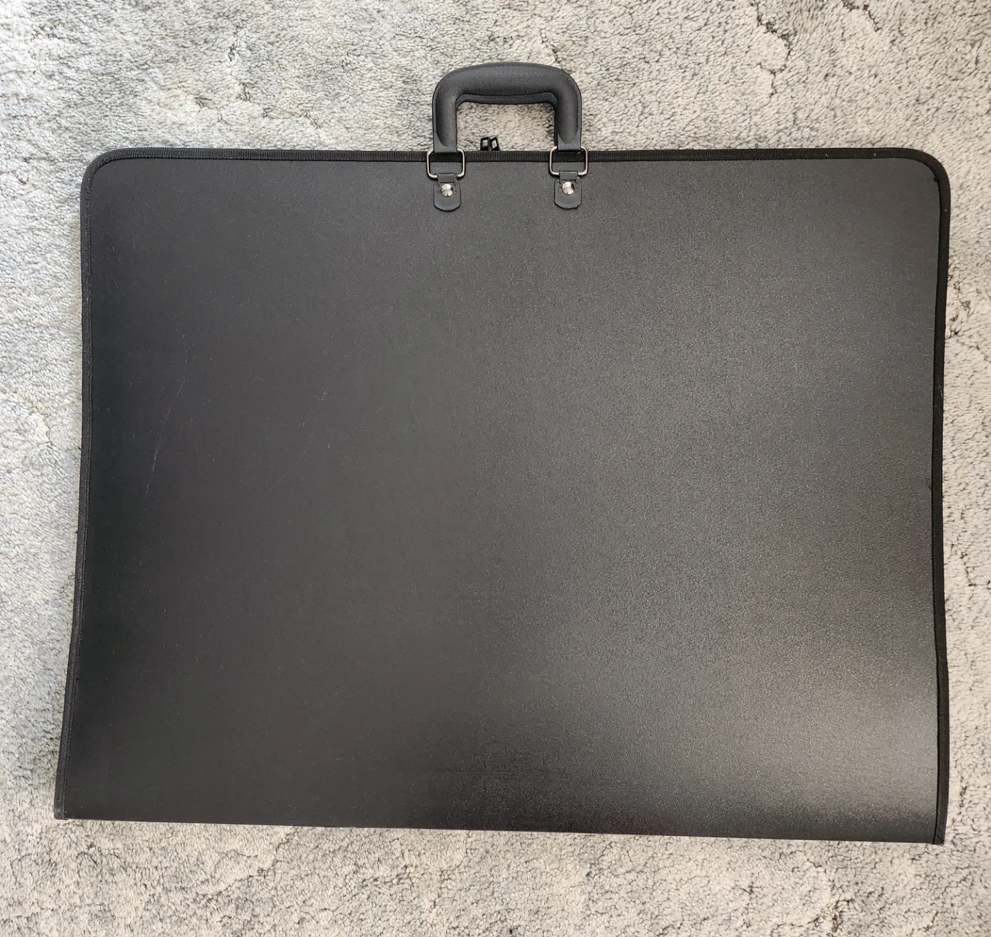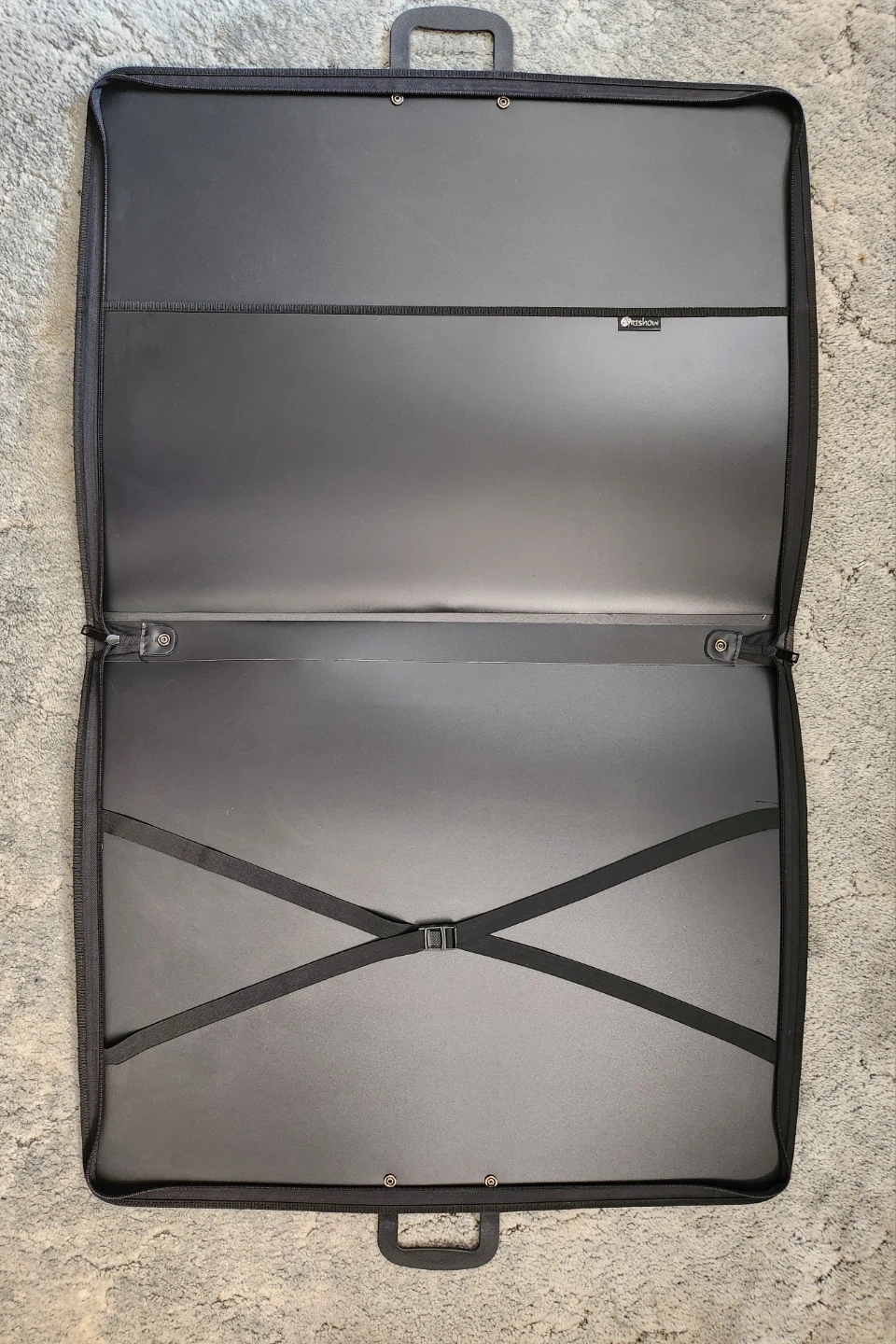 This is an ArtShow brand black portfolio case. It features a durable exterior with a zippered closure and two handles for easy carrying. Inside, elastic straps secure your artwork. Great for transporting or storing drawings and prints!