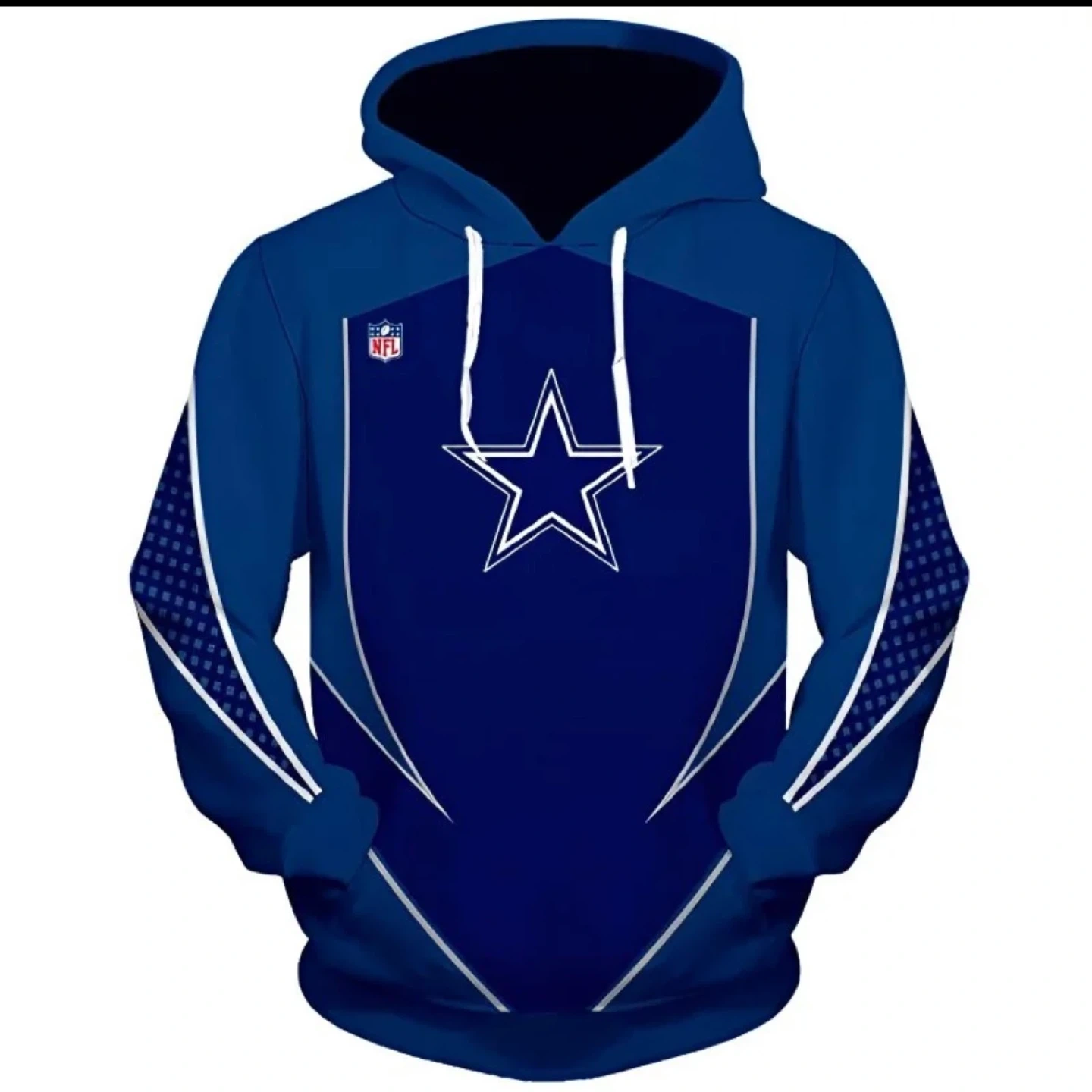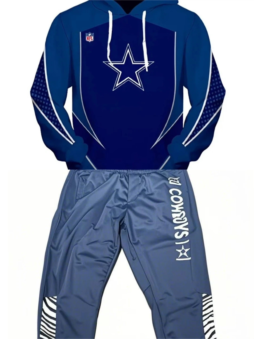 Blue Dallas Cowboys NFL tracksuit set. Track pants feature 'Cowboys' text and zebra print accents. Hoodie has a blue and white design with the Cowboys star logo and NFL emblem.