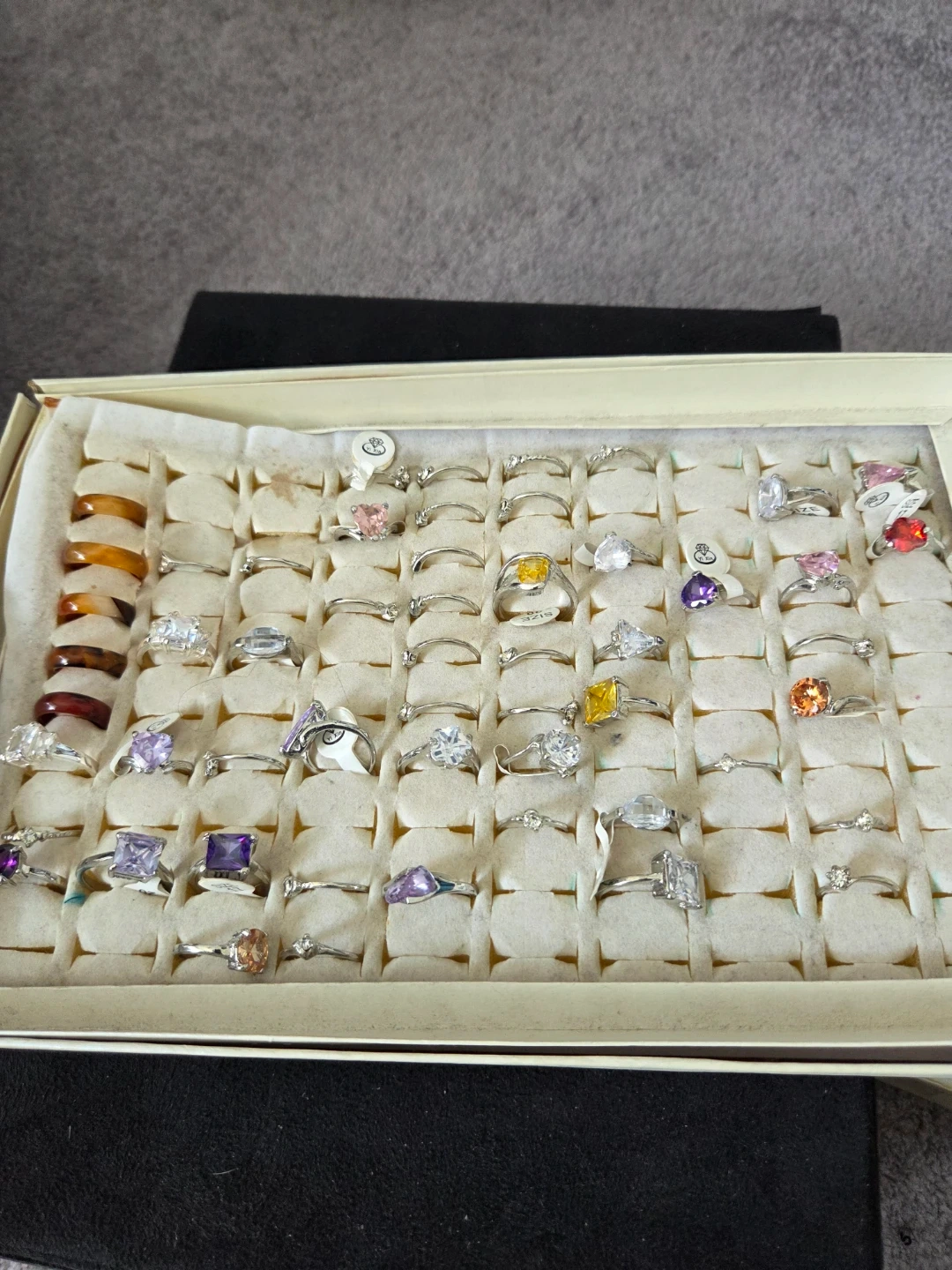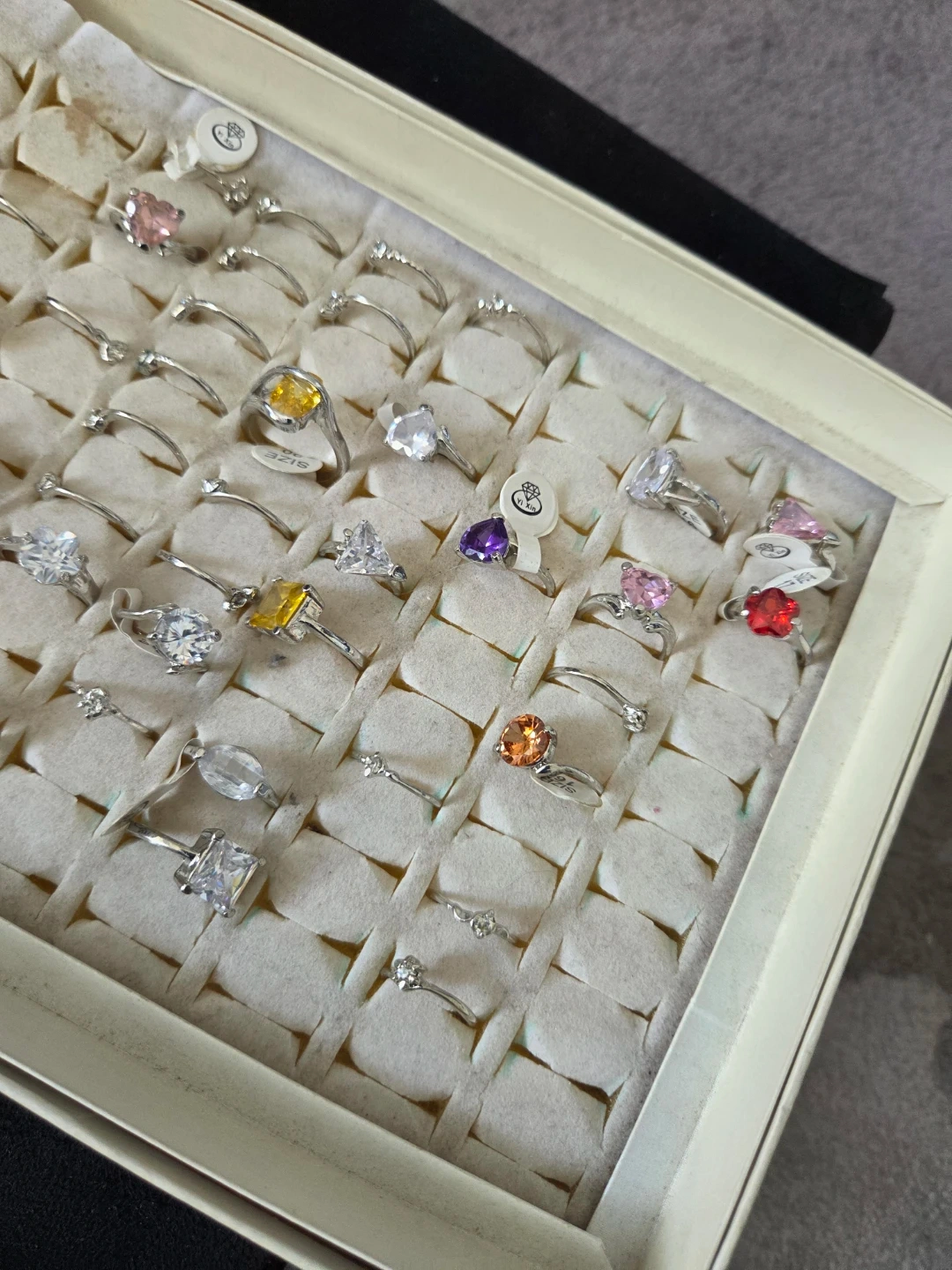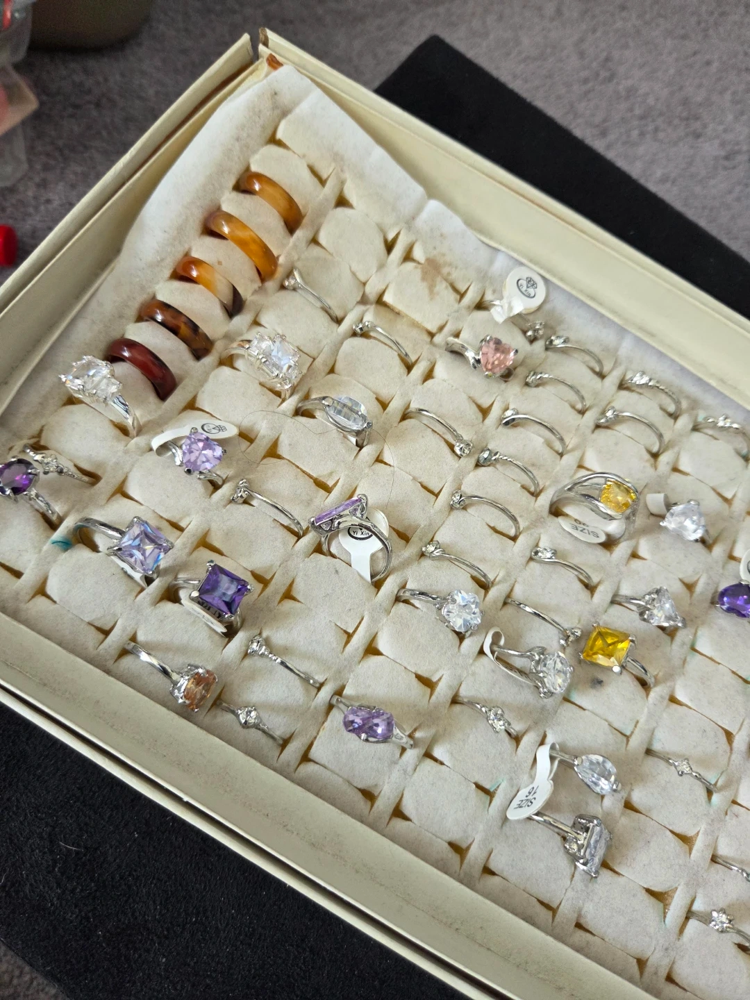 A collection of assorted gemstone rings. Various colours and designs are present, set in a silver-tone metal. The rings come in a white display box with individual slots for each ring.