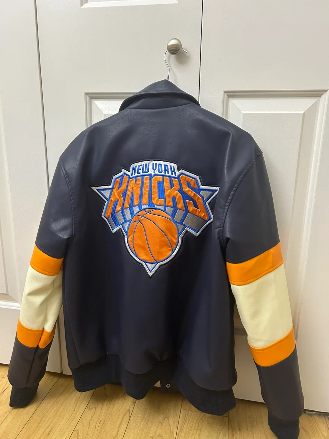 10Selling a New York Knicks jacket. It features the Knicks logo on the front and back, with orange and white accents on the sleeves. Great for any Knicks fan! Size medium price can be negotiated