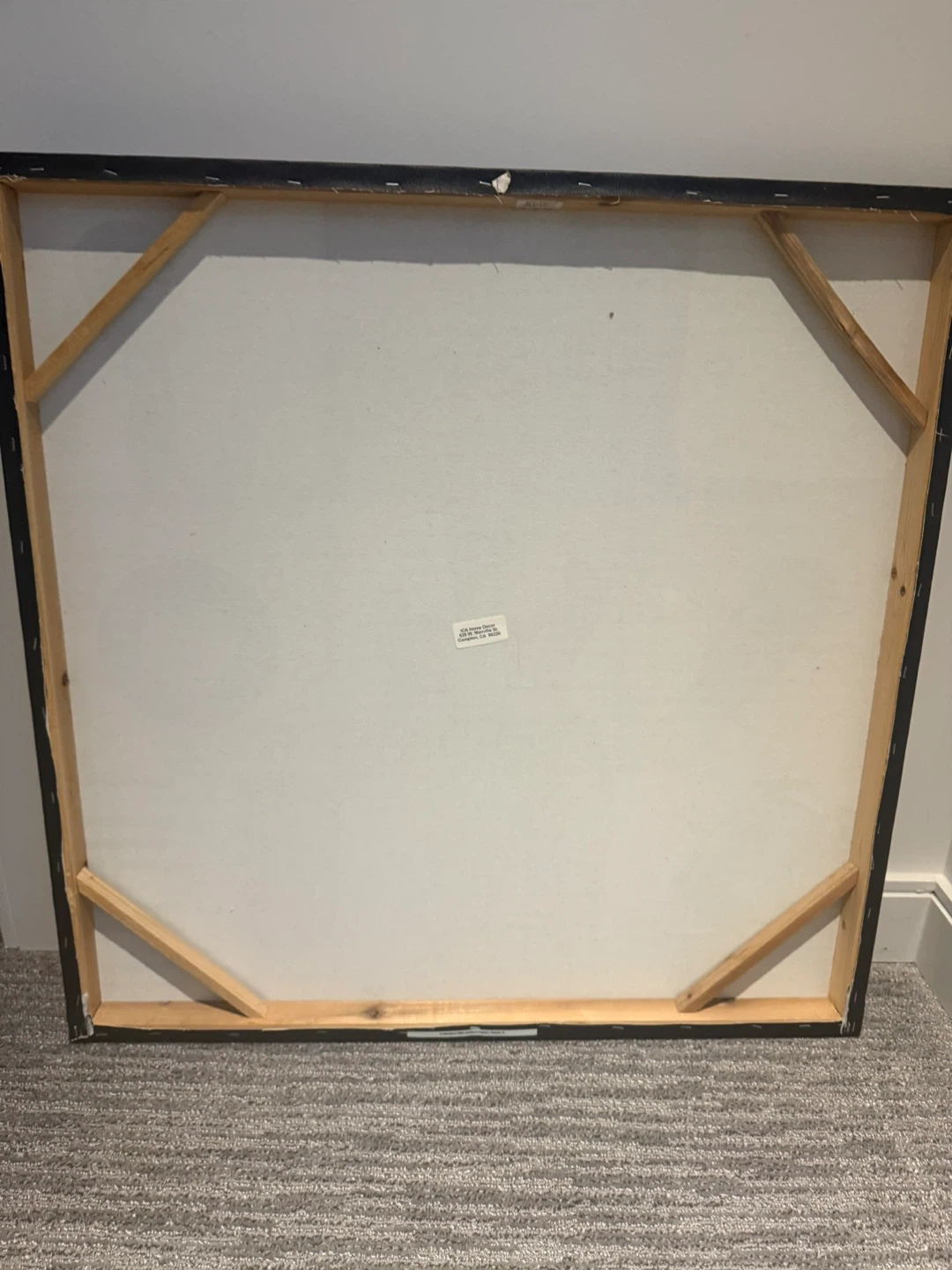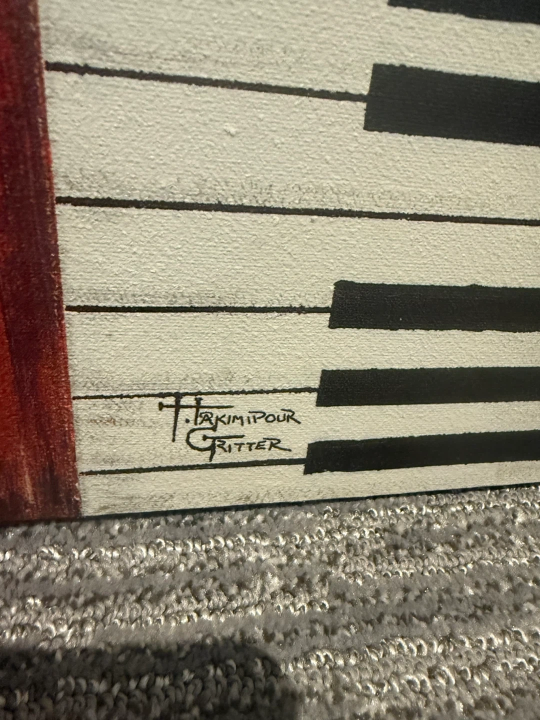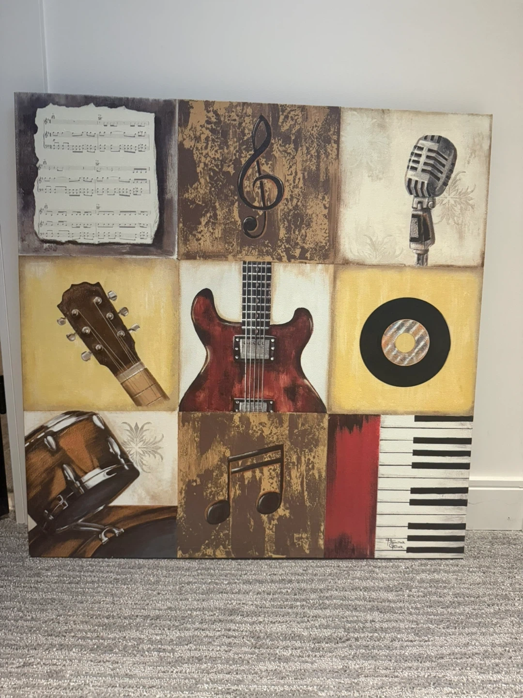 This canvas art print features a collage of musical instruments and symbols. It depicts a guitar, drum, microphone, sheet music, piano keys, and vinyl record. The artwork is signed by the artists T. Kirikipour and Ritter.