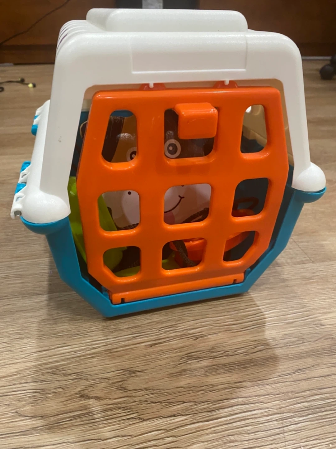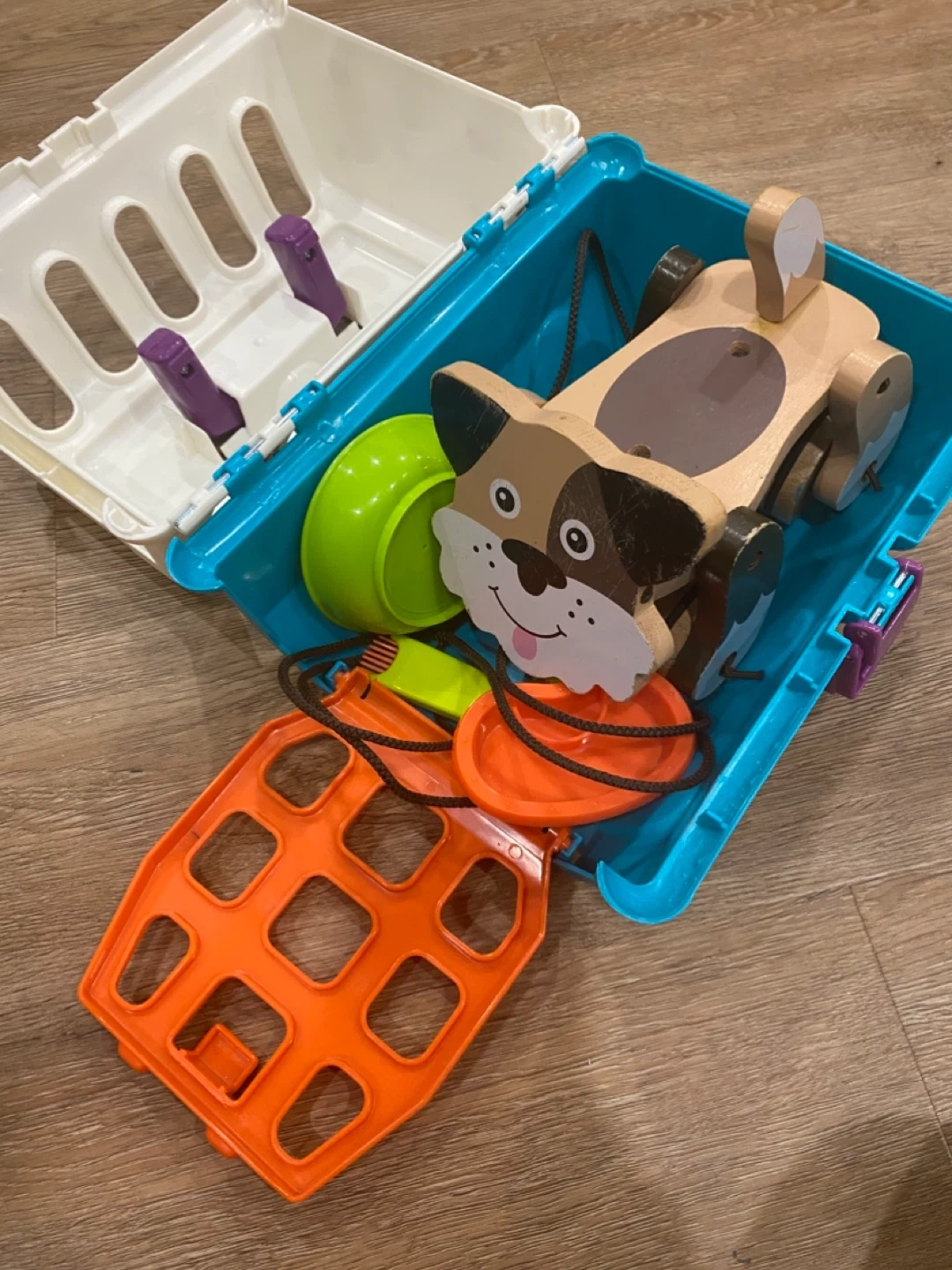 This is a Melissa and Doug wooden walking dog and battat toys pet carrier and care kit. The dog has a leash and can be walked. This carrier has an opening door, a pull-along puppy, a food bowl, and a brush. It's designed for little ones to care for their pretend pet. The carrier has paw print decorations and a handle for easy carrying.