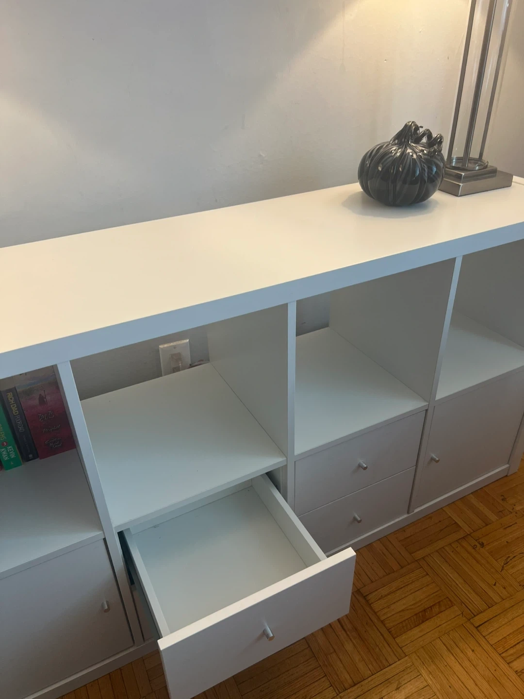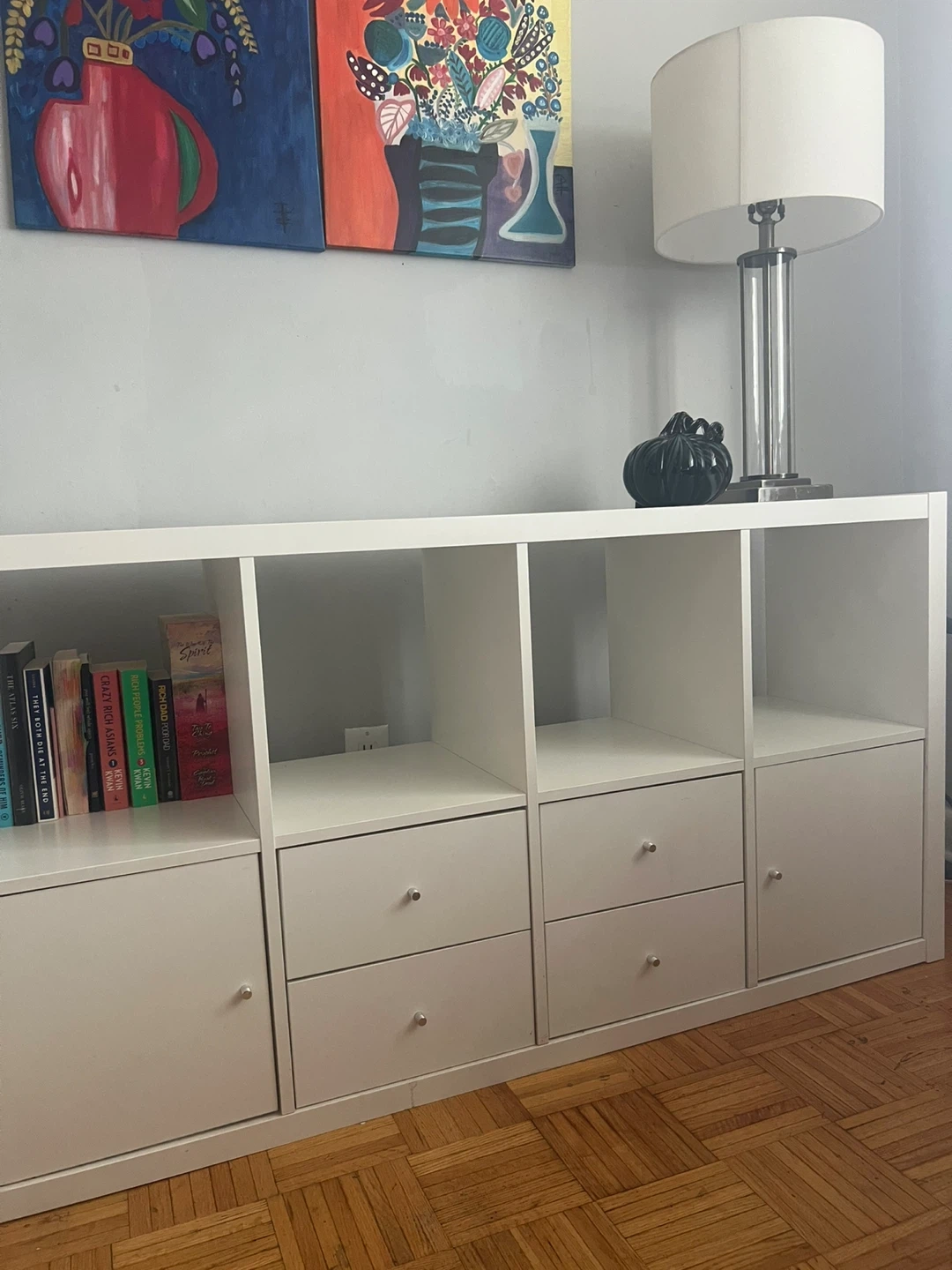 Selling a white Kallax shelf unit. It's in great shape and perfect for organizing books, toys, or anything else you need to store. It features a combination of open shelves and drawers for versatile storage options. This unit is sturdy and stylish, fitting seamlessly into any room.Good condition .147x77cm (Height)with