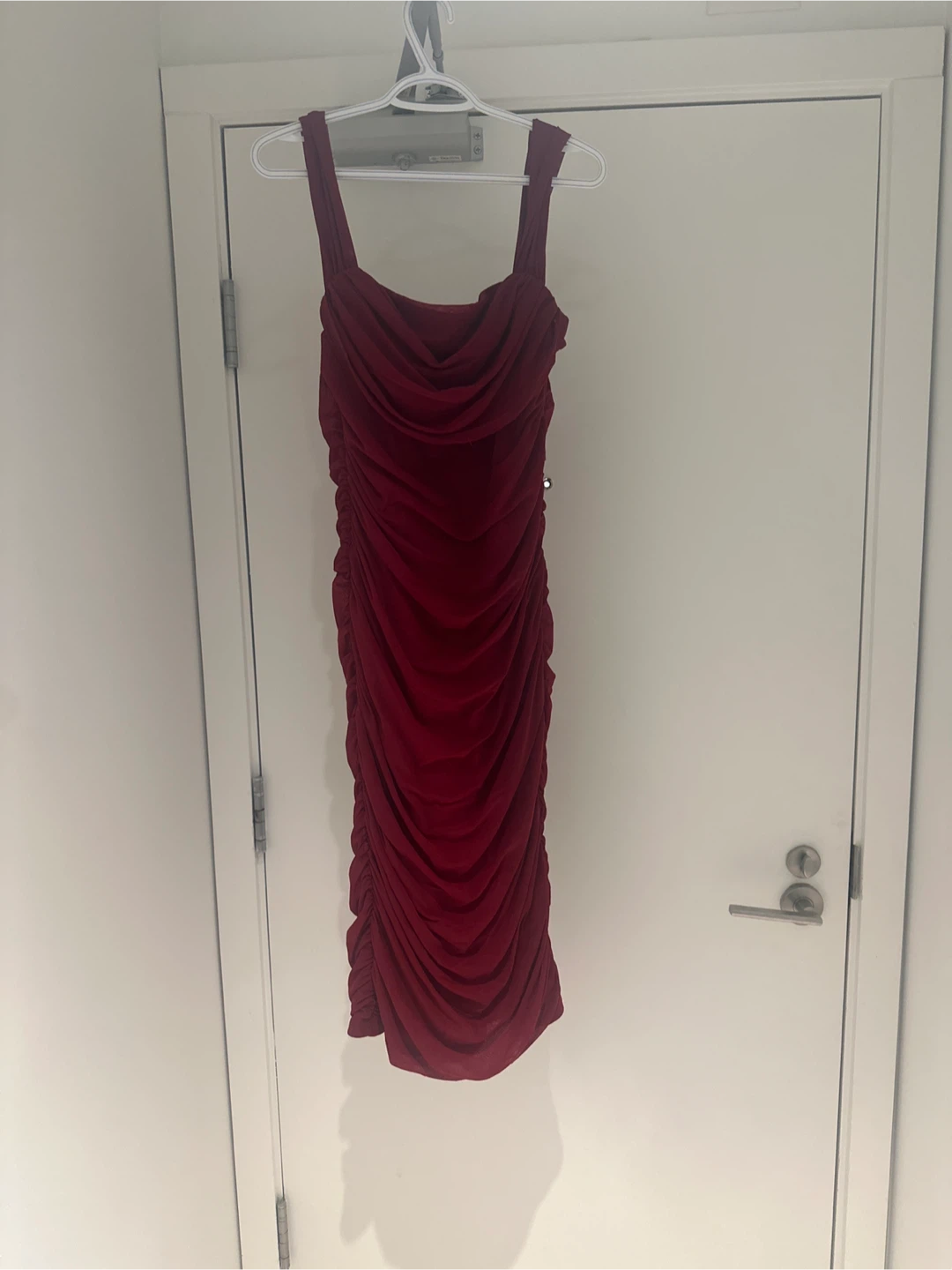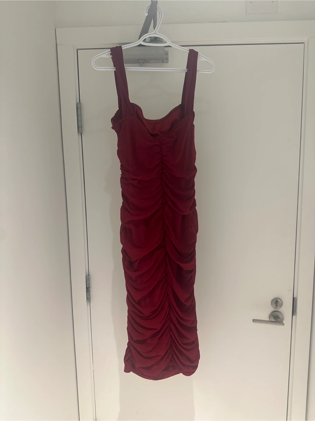 A sleeveless, ruched midi dress in a deep red colour. It features a sweetheart neckline and a flattering bodycon fit. Great for an evening out!