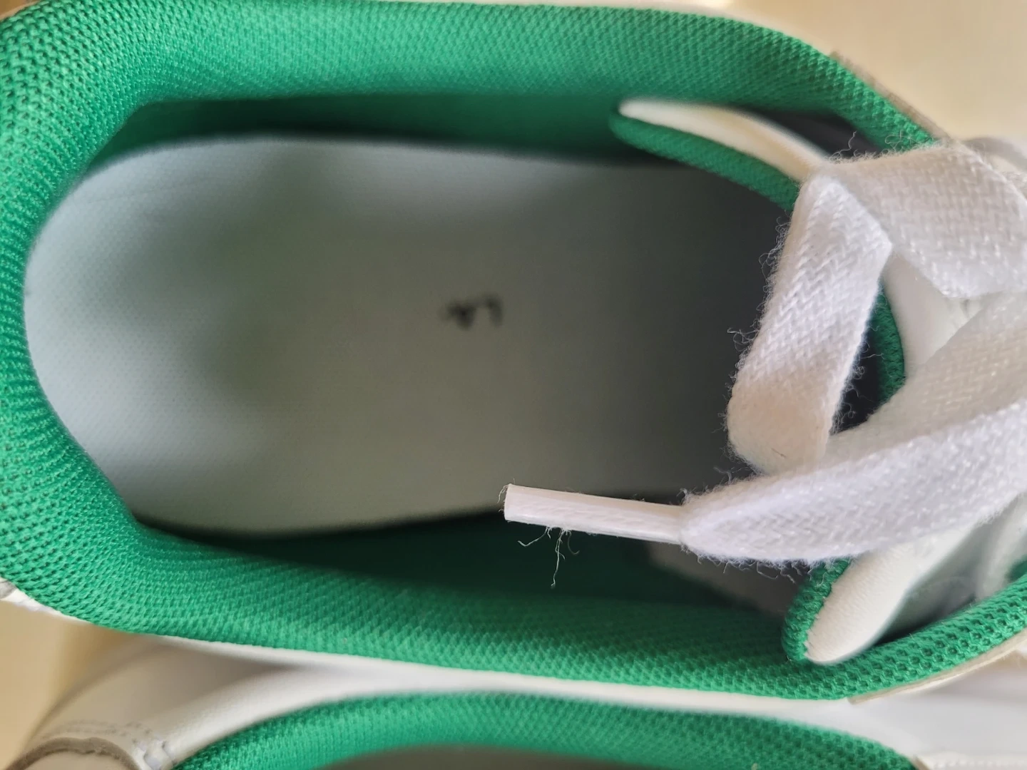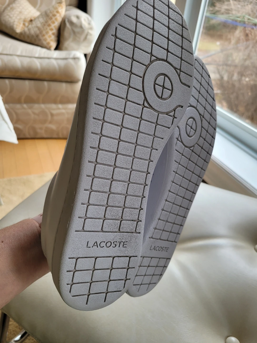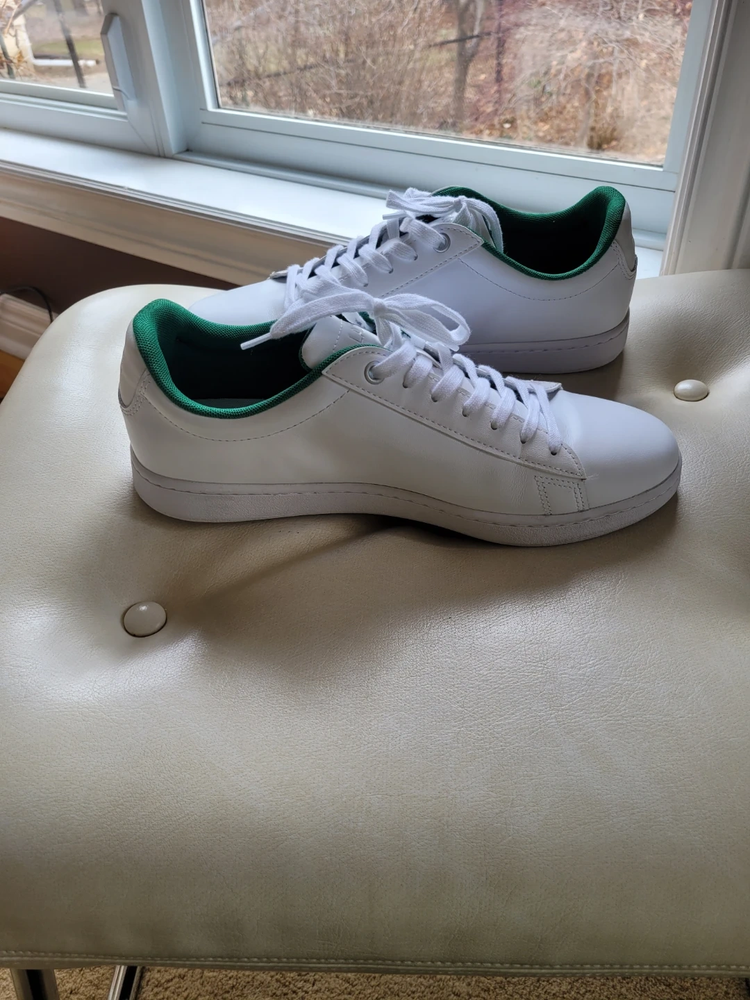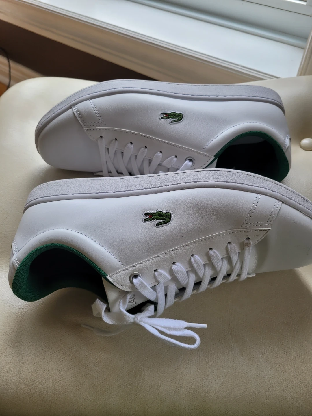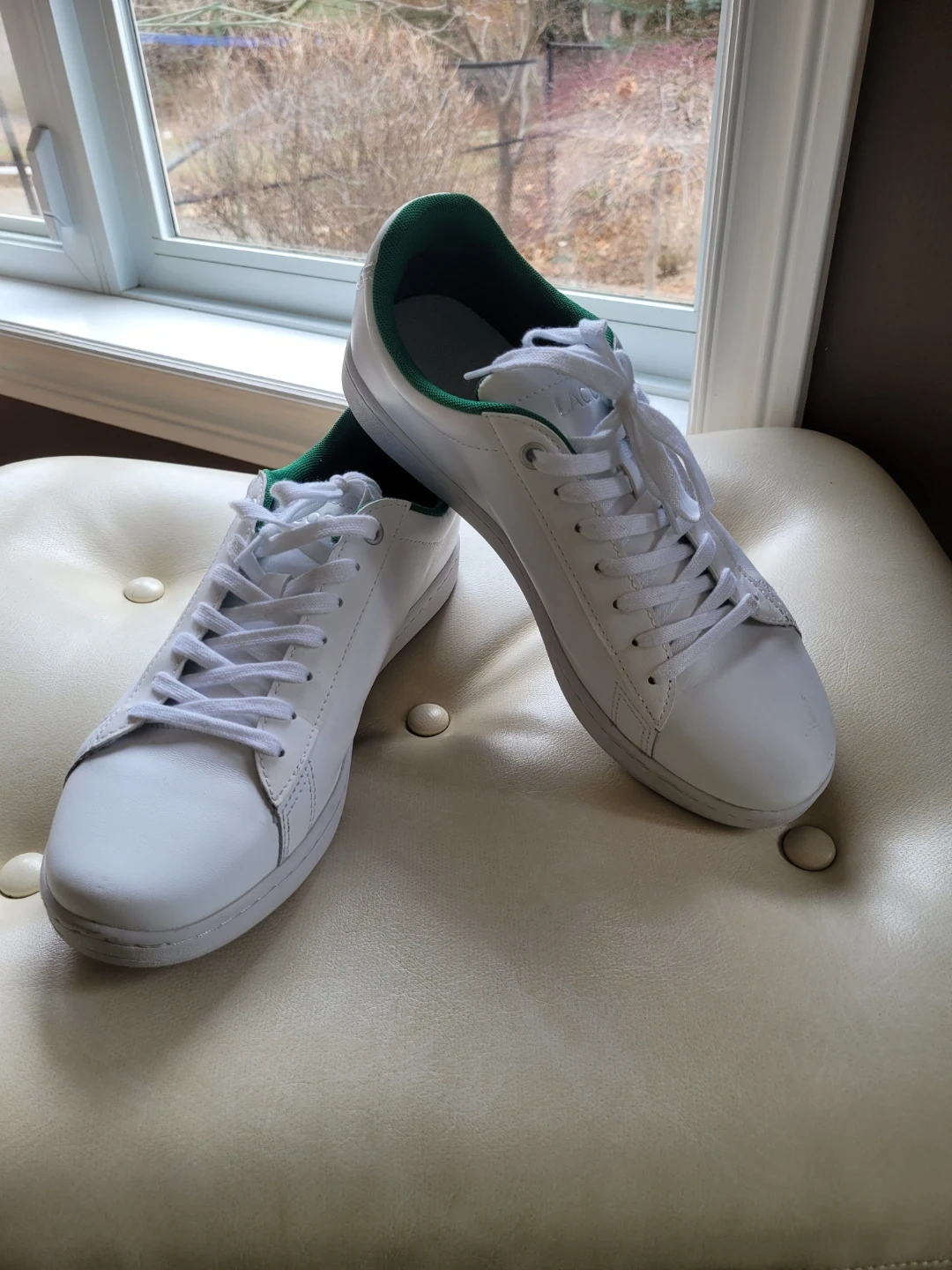 A classic pair of white leather Lacoste sneakers featuring a green trim inside the collar. They're lace-up style with a clean, minimalist design. Perfect for everyday wear! Sz 9 Extremely gently used.