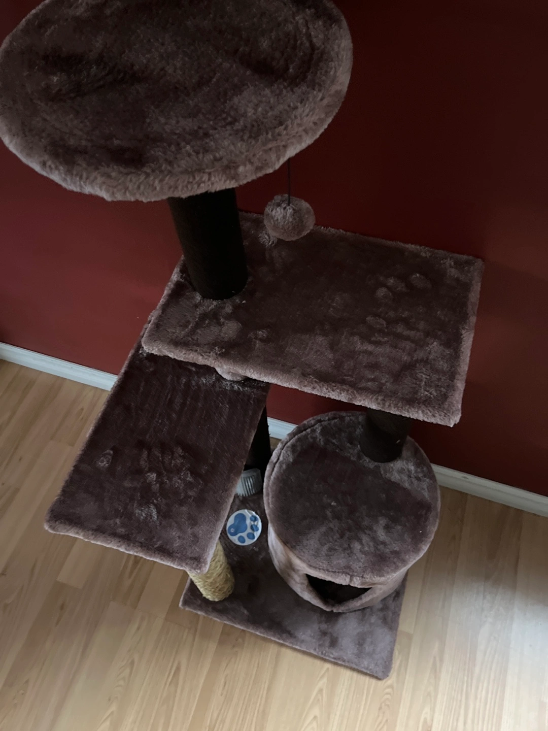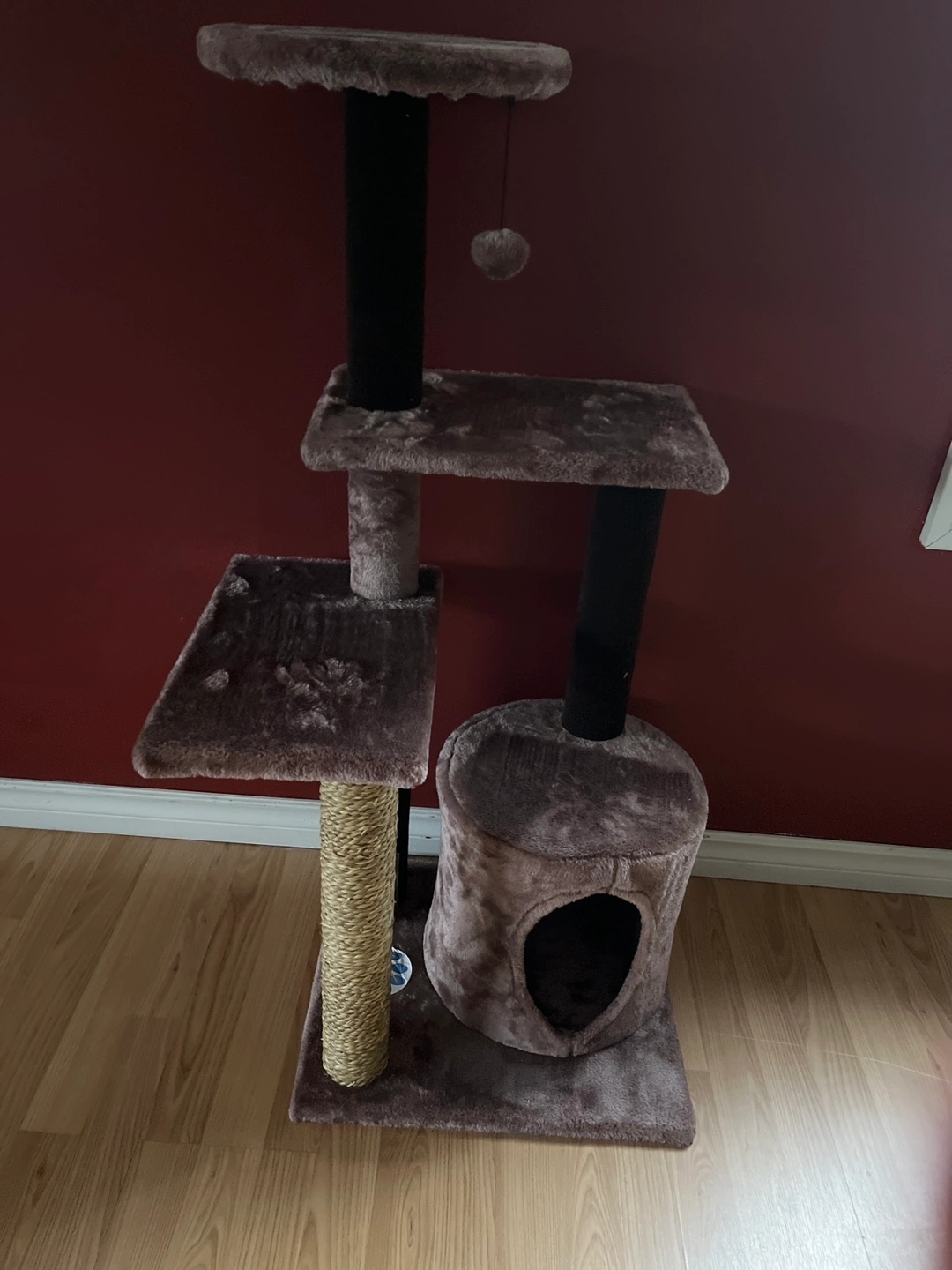 Multi-level cat tree. Features multiple platforms, a scratching post, and a cozy hideaway. Perfect for playful cats.