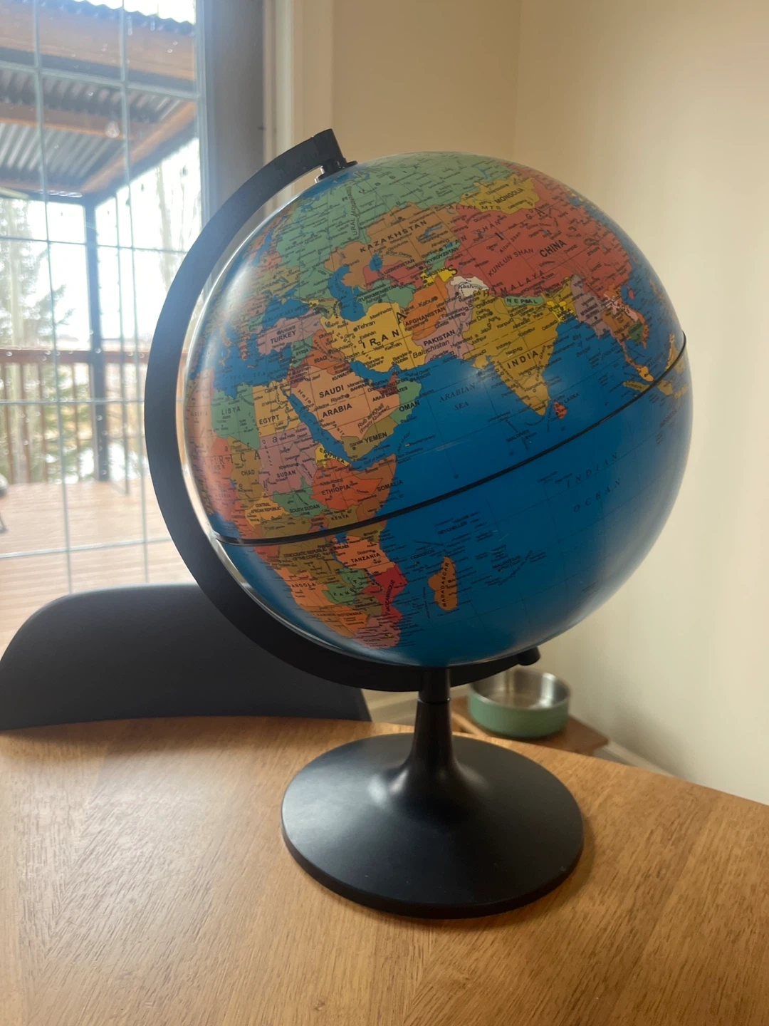 This is a standard desktop globe with a black stand. It displays country names and major cities. It's great for a home office or classroom!