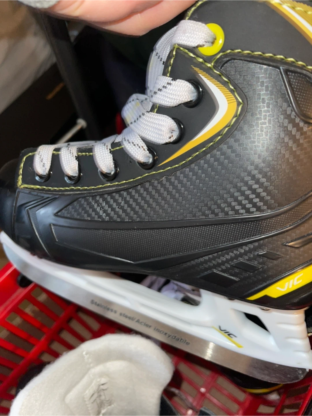 Selling hockey skates in youth size US 1 and 2. They're designed for performance and comfort on the ice. The stainless steel blades offer good durability. These skates are great for young players just starting out in the sport.