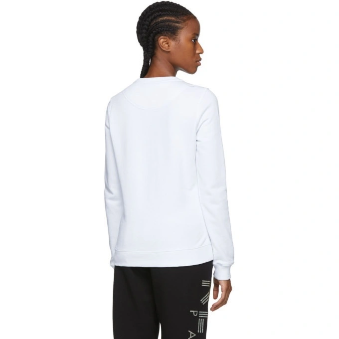 Long sleeve French terry sweatshirt in white. Rib knit crewneck collar, cuffs, and hem. Logo graphic embroidered in white, black, and red at front.