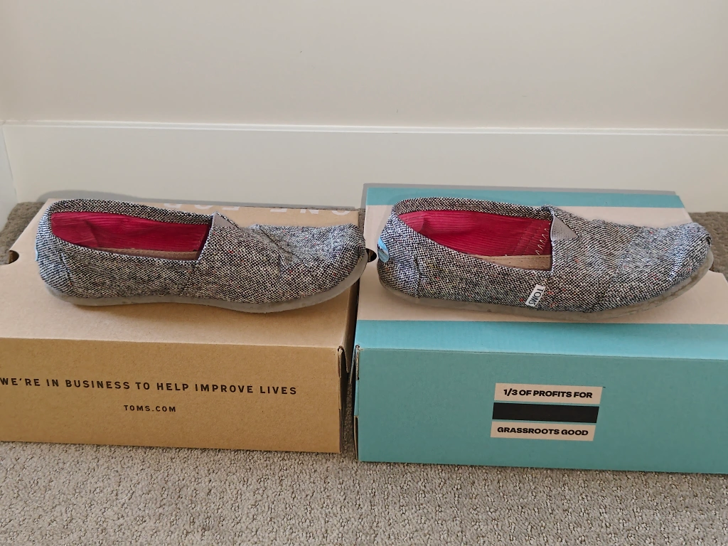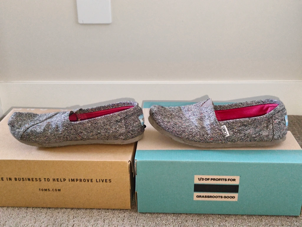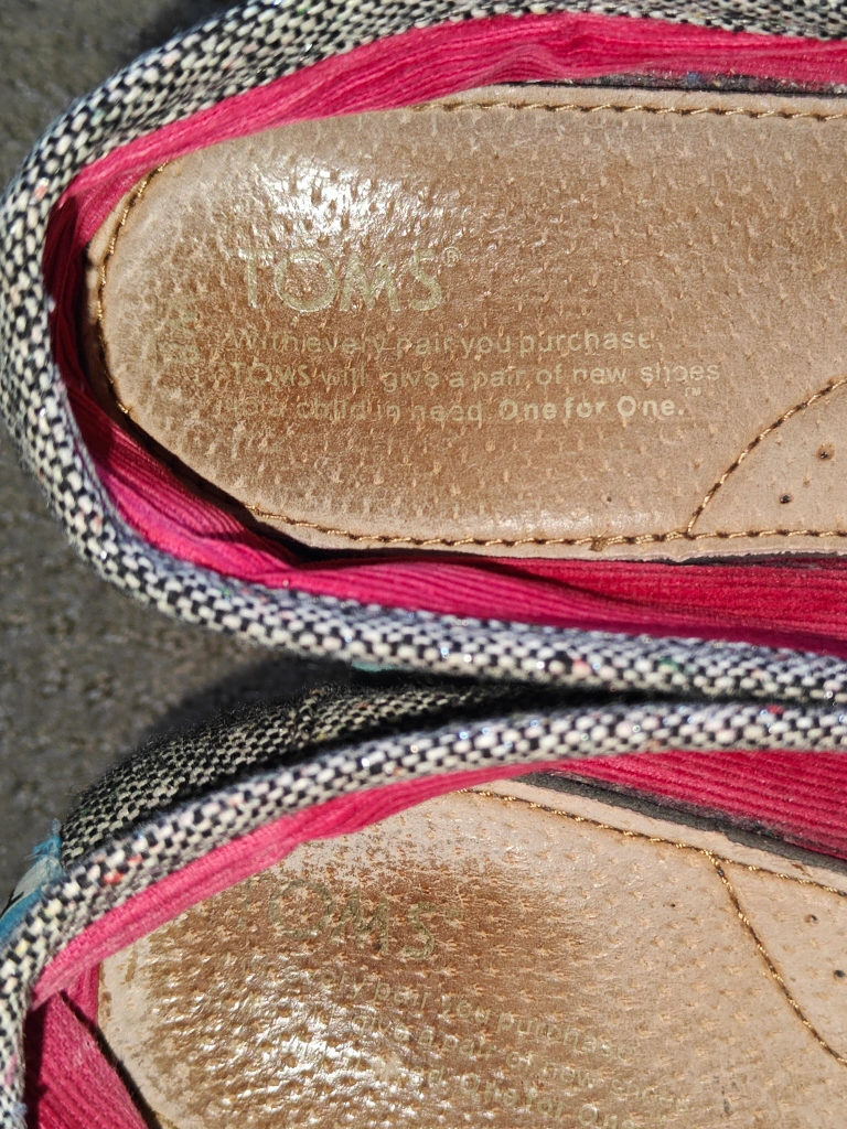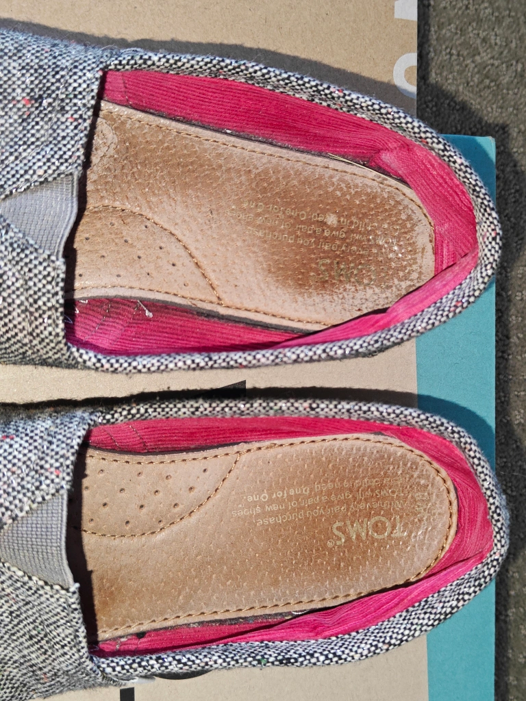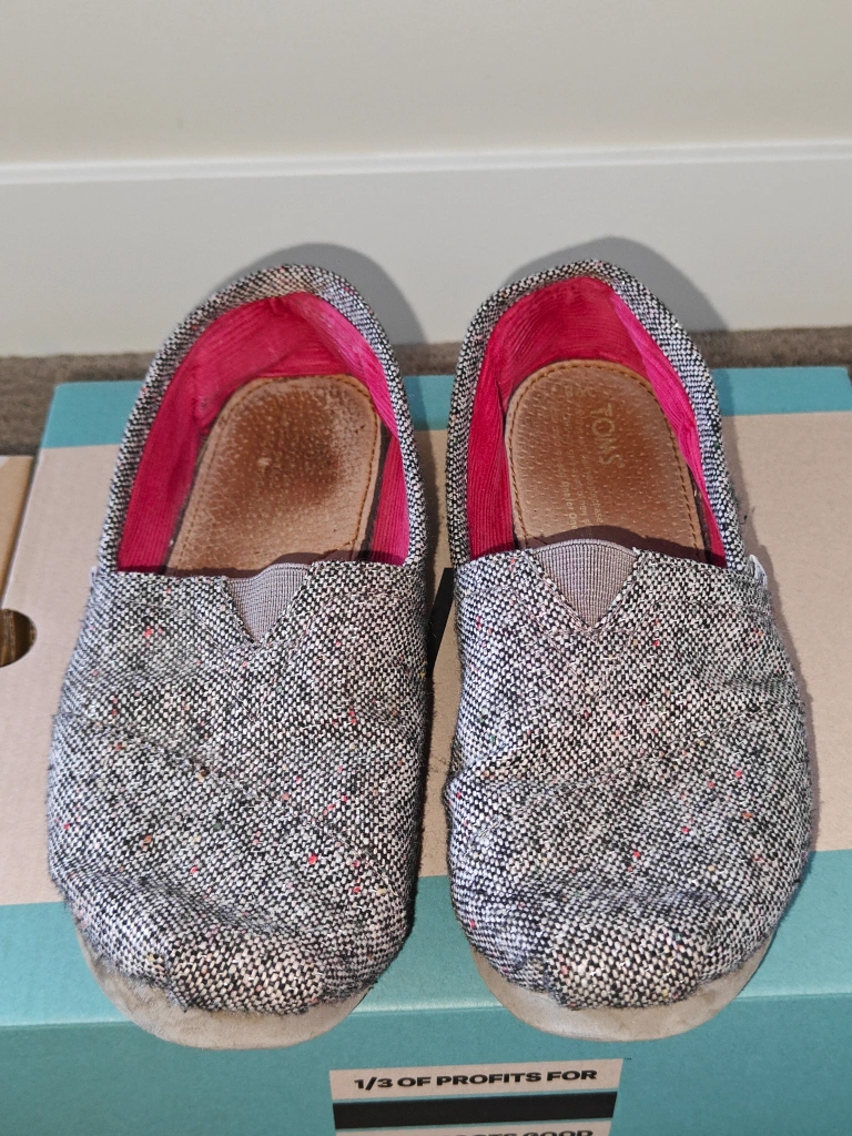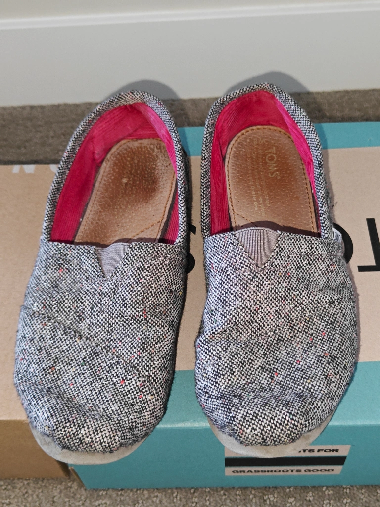 I am selling Women Tom's Slip-On Shoe - Classic Silver Karsen Sparkly Design in used, good condition. Colour is grey with faint silver sparkles. Twill textile outer. Elastic V on top for easy in and out. Red velvet inside. Lightweight and airy.